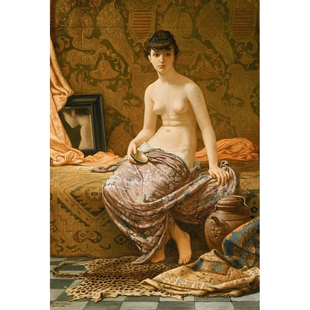 L’Odalisque af Elihu Vedder er et værk, der fremkalder en verden af sensualitet og mystik. Med sine varme nuancer og orientalske mønstre transporterer dette lærred seeren til en drømmeverden fyldt med nydelse. Den delikate komposition fremhæver den yndefulde silhuet af den kvindelige figur, omgivet af en rig detaljering, der fanger øjet. Vedders teknik, både præcis og udtryksfuld, skaber en atmosfære af ro og eftertanke. Hvert element i værket synes at fortælle en historie, den om et øjeblik ophængt mellem virkelighed og fantasi.