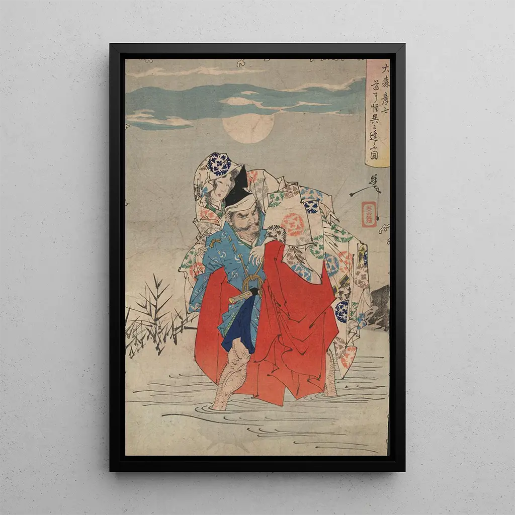Kunsttrykket af Tsukioka Yoshitoshi, med titlen "Omori Hikoshichi", tager os med ind i en verden, hvor skygger og lys flettes sammen med poetisk finesse. Dette værk, ikonisk for den japanske ukiyo-e-trykkunst, skiller sig ud med sine livlige farver og detaljerede finurligheder. Yoshitoshi, mester i ukiyo-e-teknikken, bruger subtile nuancer til at skabe en atmosfære, der er både mystisk og fængslende. Den centrale figur, klædt i traditionelt tøj, synes at træde ud af en drøm, mens baggrunden fremkalder et landskab, der er både realistisk og fantasifuldt. Dette lærred inviterer til eftertanke og afslører skjulte historier i hvert penselstrøg.