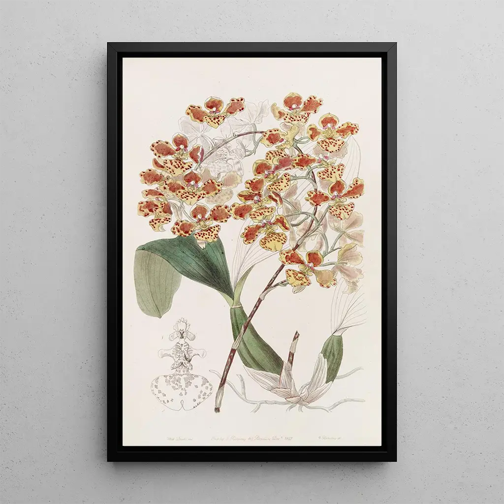 L'oncid frangé, et kunsttryk af Sydenham Edwards, tager os med ind i en blomsterverden, hvor skønheden af orkidéerne afsløres med ynde. De livlige og varierede nuancer, fra dyb lilla til strålende gult, flettes harmonisk sammen og skaber en komposition, der er både dynamisk og beroligende. Graveringsteknikken, omhyggeligt udført, gør det muligt at gengive hver detalje af blomsterne og bladene med bemærkelsesværdig præcision. Atmosfæren, der udspringer af dette kunsttryk, inviterer til eftertanke, hvor hvert blik afslører en ny facet af dette naturens vidunder.