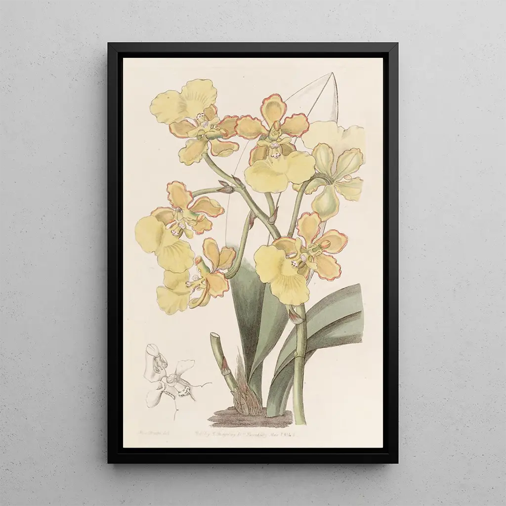 Kunstværket "Oncidium til to vorter" af Sydenham Edwards er en fejring af den naturlige skønhed, hvor hvert detalje af blomsten er omhyggeligt gengivet. De livlige farver, fra det lyse gule til det delikate brune, skaber en visuel harmoni, der straks fanger øjet. Den akvarelteknik, kunstneren bruger, gør det muligt at fange blomsternes sarhed og teksturernes rigdom. Atmosfæren, der udspringer af dette kunsttryk, er både beroligende og inspirerende, hvilket inviterer betragteren til at dykke ned i det fascinerende univers af orkidéer.