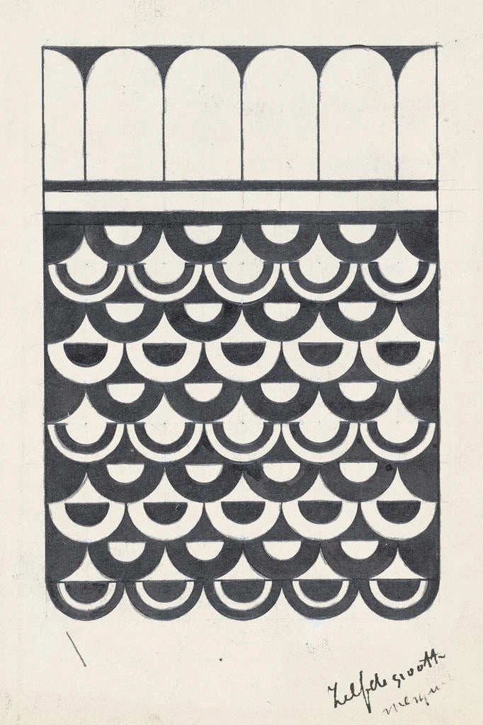 L'ornement af skæl fra Samuel Jessurun de Mesquita er et værk, der fremkalder den organiske skønhed i naturen gennem stiliserede mønstre. Skællene, delikat gengivet, synes at vibrere af liv og bevægelse, hvilket skaber en fængslende dynamik. Farvepaletten, subtilt nuanceret, fremkalder naturlige nuancer, der minder om lysreflekser på vandet. Teknikken med gravering, karakteristisk for kunstneren, giver mulighed for at lege med skygger og lys, hvilket tilføjer dybde til denne komposition. Hvert element i værket synes at interagere, hvilket danner en harmonisk helhed, der inviterer til eftertanke.