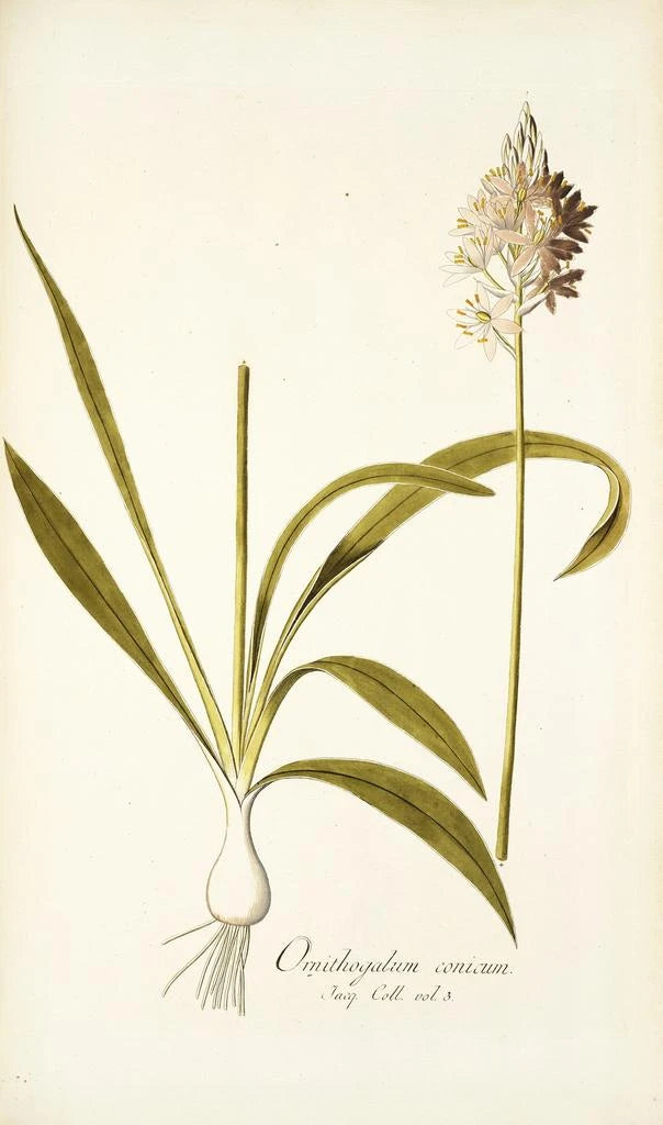 Nikolaus Joseph Freiherr von Jacquin, botaniker og kunstner fra det 18. århundrede, spillede en væsentlig rolle i udviklingen af botanisk kunsttryk. Uddannet i Wien, blev han påvirket af tidens videnskabelige opdagelser og rejste til kolonierne for at studere den lokale flora. Hans arbejde bidrog til forståelsen af eksotiske planter og dokumentationen af biodiversitet. 'Ornithogalum conicum' indgår i denne tradition, der kombinerer videnskabelig stringens med kunstnerisk følsomhed. Jacquin er anerkendt for sin evne til at forene kunst og videnskab, hvilket gør hans værker til uundværlige referencer for botanikere og kunstnere.