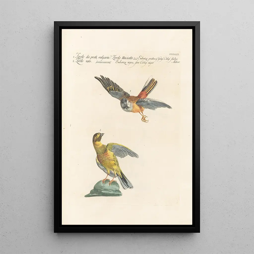 Kunsttrykket af Ornithologia metodeice digesta Pl331 tager os med ind i en fascinerende verden, hvor naturen udtrykker sig med glans. Saverio Manettis delikate illustrationer fanger fuglenes ynde og afslører fine detaljer i fjerdragter og positurer. De livlige og harmoniske farver, der spænder fra dybblå til strålende gule, skaber en levende og glædesfyldt atmosfære. Hvert element i kompositionen synes at danse under lyset, hvilket inviterer betragteren til en omhyggelig betragning af fuglenes skønhed. Dette værk, både videnskabeligt og kunstnerisk, vidner om en passion for naturens observation.