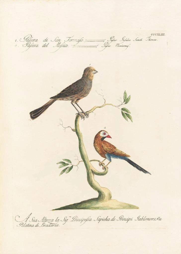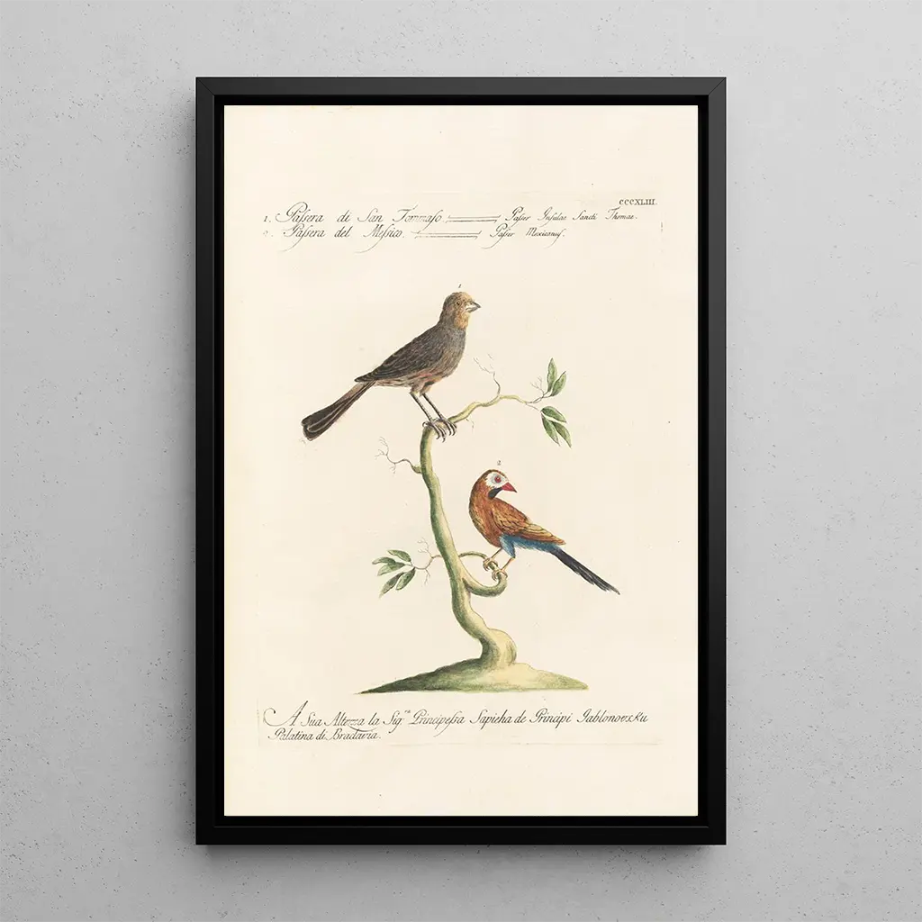 Kunsttrykket af Ornithologia metode digesta Pl325 af Saverio Manetti tager os med ind i en verden rig på farver og former, hvor hver fugl er afbildet med omhu og præcision. De strålende nuancer og de fine detaljer i fjerdragten vidner om en opmærksom observation af naturen. Den anvendte teknik, både præcis og udtryksfuld, skaber en levende atmosfære, der inviterer til forundring. Hver fugl, fanget i en naturlig positur, fremkalder en følelse af bevægelse og liv, hvilket gør dette kunsttryk til et sandt mesterværk inden for kunstnerisk ornitologi.