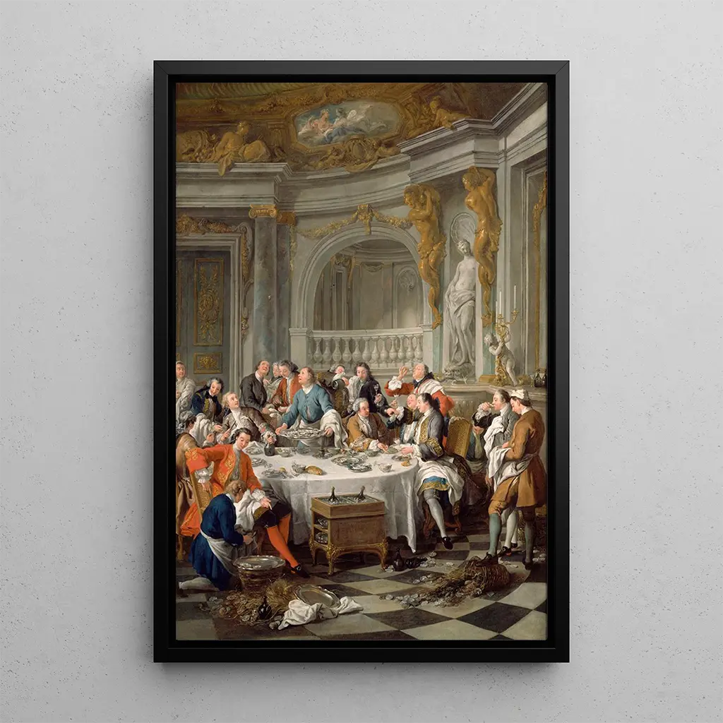 I "Le Déjeuner d'huîtres" dykker Jean-François de Troy ned i en hyggelig scene, hvor gastronomien står i centrum. De livlige farver og de omhyggelige detaljer i de anrettede retter på bordet fremkalder en festlig og raffineret atmosfære. Personerne, elegant klædt, engagerer sig i en livlig samtale, mens østersene, symboler på havet og kulinarisk rigdom, har en central plads. Det naturlige lys, filtreret gennem et vindue, oplyser scenen og tilføjer en levende og varm dimension til denne komposition.