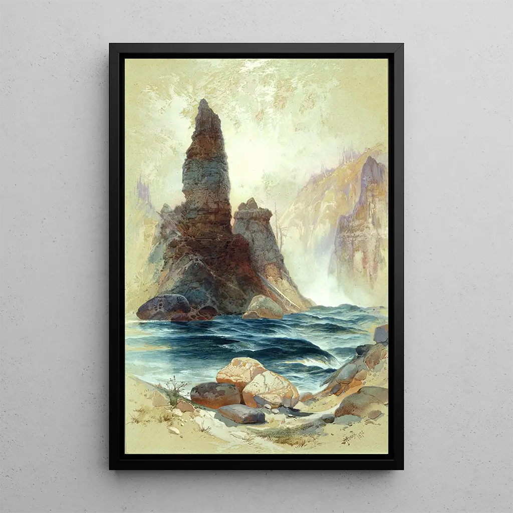 Thomas Moran, en indflydelsesrig kunstner fra det 19. århundrede, formåede at fange storheden af de amerikanske landskaber gennem sine værker. Født i England, emigrerede han til USA, hvor han blev dybt inspireret af landets spektakulære landskaber, især nationalparkerne. Hans stil, der kombinerer romantik og realisme, har bidraget til at forme opfattelsen af de amerikanske landskaber i kunsten. "Over vandfaldende i Yellowstone-tårnet" illustrerer perfekt hans talent for at skildre naturen med følelsesmæssig intensitet, samtidig med at han spiller en central rolle i bevidstheden om bevarelsen af disse naturlige skatte.