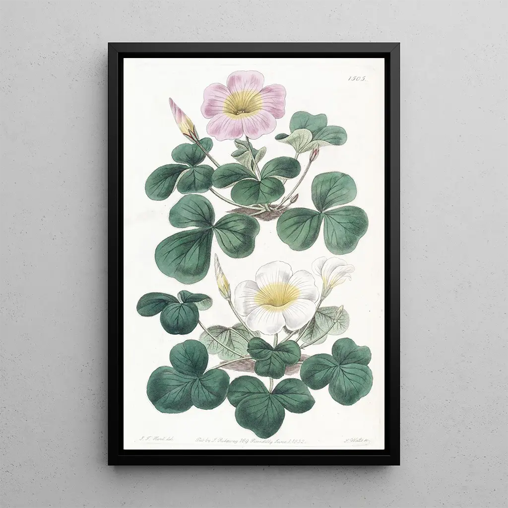Kunsttrykket "Oxalis variabel" af Sydenham Edwards er en fejring af plantens elegance og skønhed. Dette maleri fremhæver de hjerteformede blade og de delikate blomster af oxalis, hvilket skaber en blid og beroligende atmosfære. De grønne og gule nuancer blandes let, hvilket fremkalder forårets friskhed. Edwards' illustrationsteknik, kendetegnet ved omhyggelige detaljer, giver en følelse af teksturen af bladene og blomstens skrøbelighed. Hvert element i denne komposition synes at vibrere under lyset, hvilket inviterer betragteren til at værdsætte naturens flygtige skønhed.