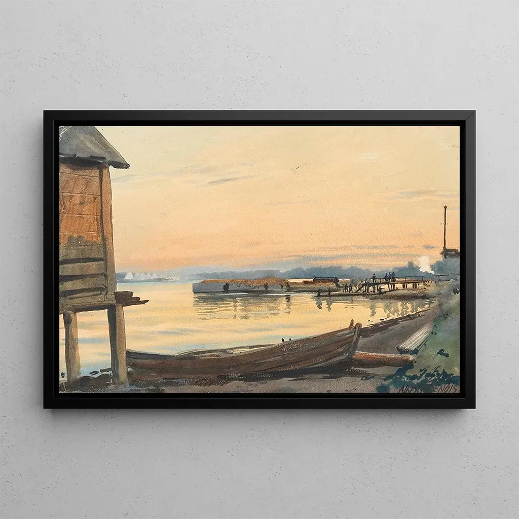 På floden Neva fanger Albert Nikolaïevitch Benois magien af et suspendet øjeblik. Lærredet udfolder en palette af blå og grønne nuancer, der fremkalder de funklende reflekser af vandet under solen. Bådene glider fredeligt, mens silhuetterne af bygninger i baggrunden skitseres med finesse. Benois' teknik, der blander impressionisme og realisme, skaber en atmosfære af ro og eftertanke. Hvert penselstrøg synes at invitere betragteren til at dykke ned i denne fredelige scene, hvor tiden synes at stå stille, og tilbyder en flugt fra den moderne verdens travlhed.