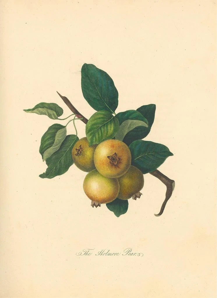 Kunsttrykket af Poire Holmore, værket af Thomas Andrew Knight, tager os med ind i en verden, hvor naturen fejres med finesse. Nuancerne af grøn og gul blander sig harmonisk, hvilket skaber en beroligende atmosfære. Akvarellens teknik, med sine subtile overgange, giver dette maleri en lethed, der vækker minder om frugtplantagernes friskhed. Hvert detalje, fra bladene til dugdråberne, synes at fange et flygtigt øjeblik af frugtbarhedens liv, og inviterer betragteren til en rolig refleksion og en værdsættelse af den naturlige skønhed.