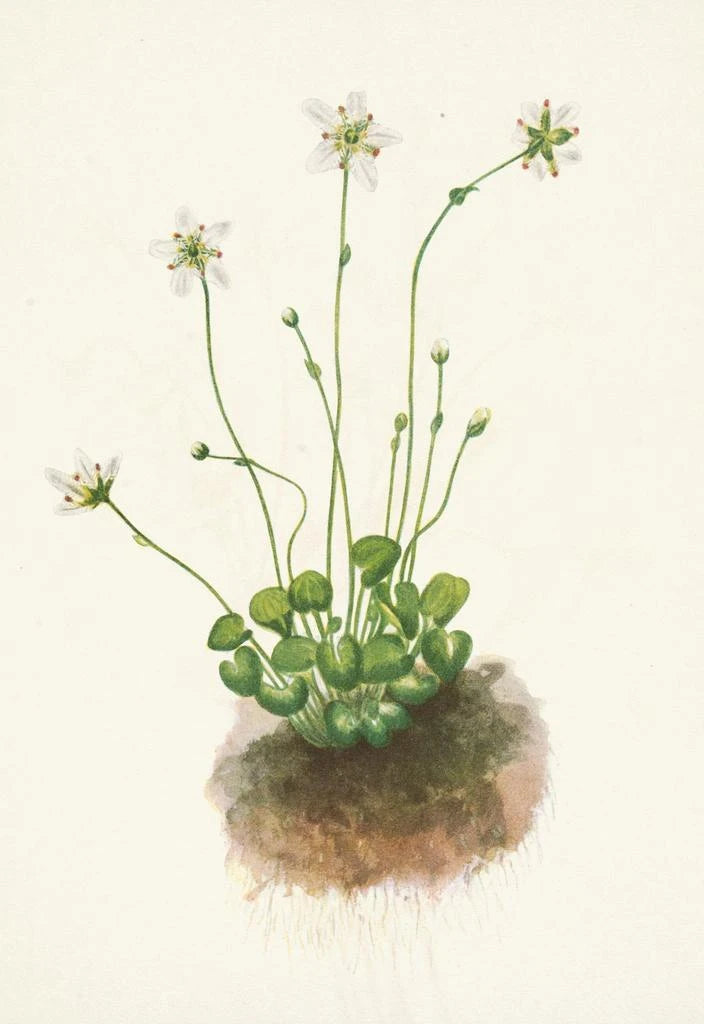 Den franjede parnassie, eller Parnassia fimbriata, præsenterer sig med en sjælden elegance, dens hvide blomster med fine fjerlignende kanter, der fremkalder renheden i enge. Mary Vaux Walcott, med sit talent, fanger letheden af denne plante og afslører en verden, hvor naturen udtrykker sig i al sin pragt. De fine detaljer i kronblade og blade, kombineret med en blid palet, skaber en rolig og beroligende atmosfære. Hvert penselstrøg synes at fortælle en historie, om et skrøbeligt og værdifuldt økosystem, der inviterer betragteren til at dykke ned i en fortryllende blomsterverden.