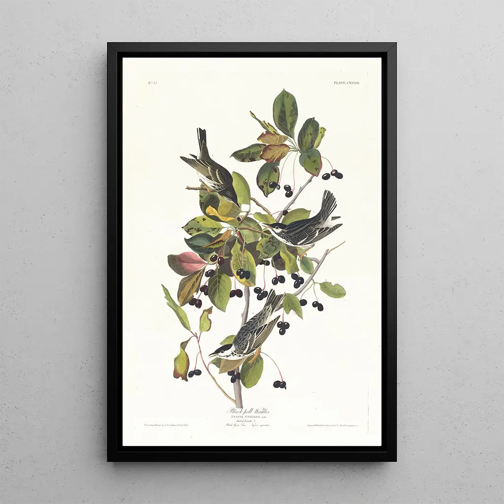 Kunsttrykket af Paruline rayée fordyber os i en verden fyldt med farver og liv. Med sine fjer i nuancer af gult og sort ser denne fugl ud til at fange sollyset, hvilket skaber en varm og indbydende atmosfære. Audubons teknik, der kombinerer akvarel og gravure, giver en uovertruffen dybde til hver detalje, fra nervaturen på bladene til reflekserne i fjerene. Dette kunsttryk fremkalder en scene fra naturen, hvor skønhed og skrøbelighed i dyrelivet mødes, hvilket inviterer til en stille og respektfuld eftertanke.