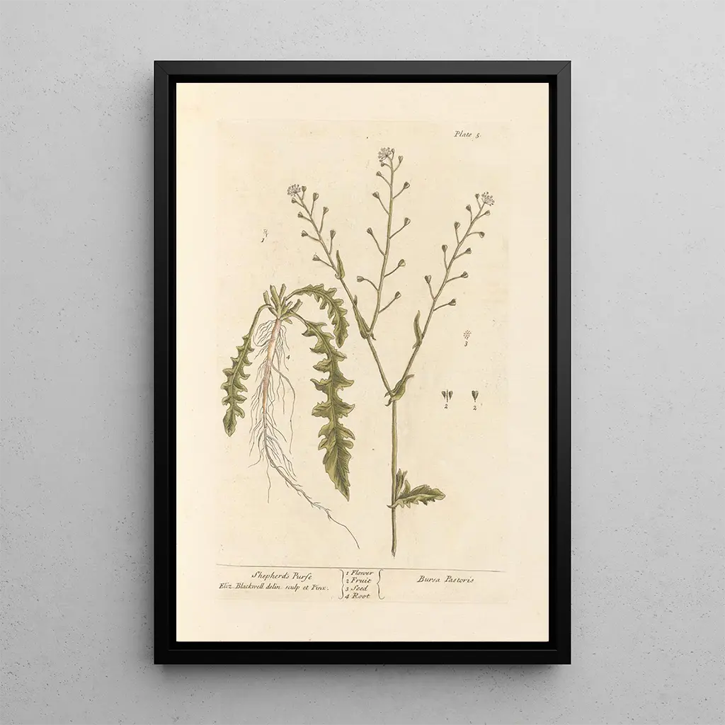 Kunsttrykket "Bourse-à-pasteur" af Elizabeth Blackwell er en fængslende illustration, der fremhæver denne plantes ynde. De omhyggelige detaljer og de bløde farver afslører en kunstnerisk tilgang præget af poesi. Hvert element i kompositionen, fra blade til blomster, er omhyggeligt gengivet, hvilket skaber en beroligende og harmonisk atmosfære. Dette værk inviterer til en visuel udforskning, hvor naturens skønhed afsløres med ynde og subtilitet.