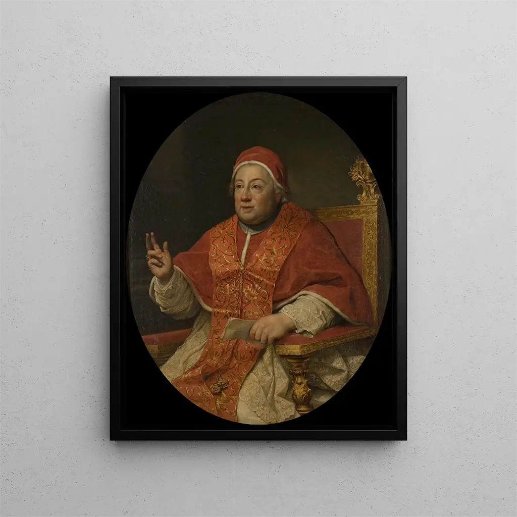 Reproduktion Den pavel Clement XIII - Anton Raphaël Mengs – Fascinerende introduktion I det rige og komplekse kunsthistoriske landskab skiller visse værker sig ud ved deres evne til at fange ikke kun et emnes essens, men også ånden fra en æra. "Den pavel Clement XIII" af Anton Raphaël Mengs er et af disse ikoniske værker, der transcenderer det enkle portræt for at blive en ægte kunstnerisk erklæring. Dette maleri, malet i det 18. århundrede, fremkalder både den katolske kirkes storhed og den rococo-stilens finesse, samtidig med at det afslører personligheden af en pave, hvis regeringstid var præget af både åndelige og politiske udfordringer. Stil og særpræg ved værket Mengs' stil kendetegnes ved en harmoni af farver og en finhed i træk, der giver hans portrætter en sjælden elegance. I "Den pavel Clement XIII" formår maleren at formidle et indtryk af værdighed og sindsro. Valget af klædedragter, de subtile nuancer i hudtonerne og den eftertænksomme udtryksfuldhed i paven vidner om en enestående håndværksmæssig kunnen. Mengs, påvirket af renæssancens mestre, formår at fusionere tradition og innovation, hvilket skaber et portræt, der er både trofast og idealiseret. Lyset spiller en central rolle i dette værk, fremhæver detaljerne i ansigtet og tøjet, samtidig med at det giver en næsten guddommelig atmosfære til fremstillingen af paven. Dette maleri nøjes ikke med at skildre en kirkens mand; det indkapsler en vision om åndeligt magt, der afslører spændinger og aspirationer i en tid i hastig forandring. Kunstneren og hans indflydelse Anton Raphaël Mengs, født i 1728, betragtes som en af sin tids største malere. Hans uddannelse i Italien, hvor han omgåsede de store mestre, har dybt påvirket hans stil. Mengs nøjes ikke med blot at være en portrætmaler; han er også en kunstteoretiker, der fremhæver vigtigheden af studiet af de gamle mestere og naturen. Hans nyskabende tilgang har præget hans samtidige og åbnet vejen for mange neoklassiske kunstnere. Faktisk har hans evne til at kombinere teknisk præcision med følelsesmæssig følsomhed inspireret generationer af malere. "Den pavel Clement XIII" indskriver sig i denne tradition, hvilket vidner om