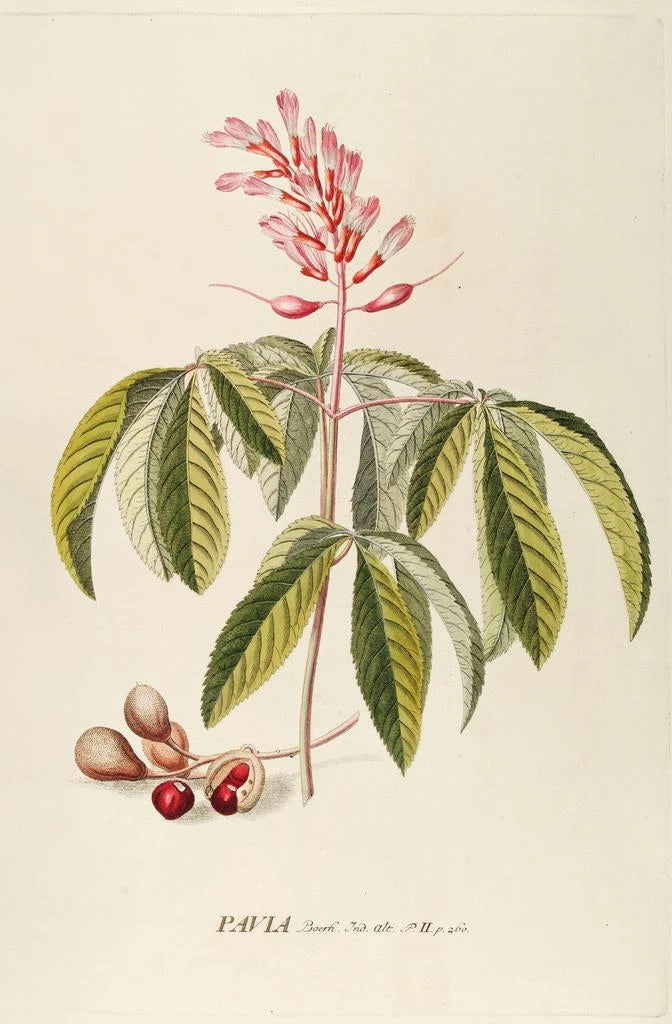 Den kunsttryk Pavia af Georg Dionysius Ehret tager os med ind i en botanisk verden af enestående rigdom. Dette værk, skabt med bemærkelsesværdig omhu, fremhæver livlige farver og slående detaljer, der fanger selve essensen af floraen. Nuancer af grøn, gul og rød blandes harmonisk, hvilket skaber en atmosfære, der er både livlig og beroligende. Teknikken med kobbergravure, anvendt af Ehret, gør det muligt at gengive hver enkelt blomst og blad med utrolig præcision, hvilket inviterer betragteren til en dyb refleksion over den naturlige skønhed.