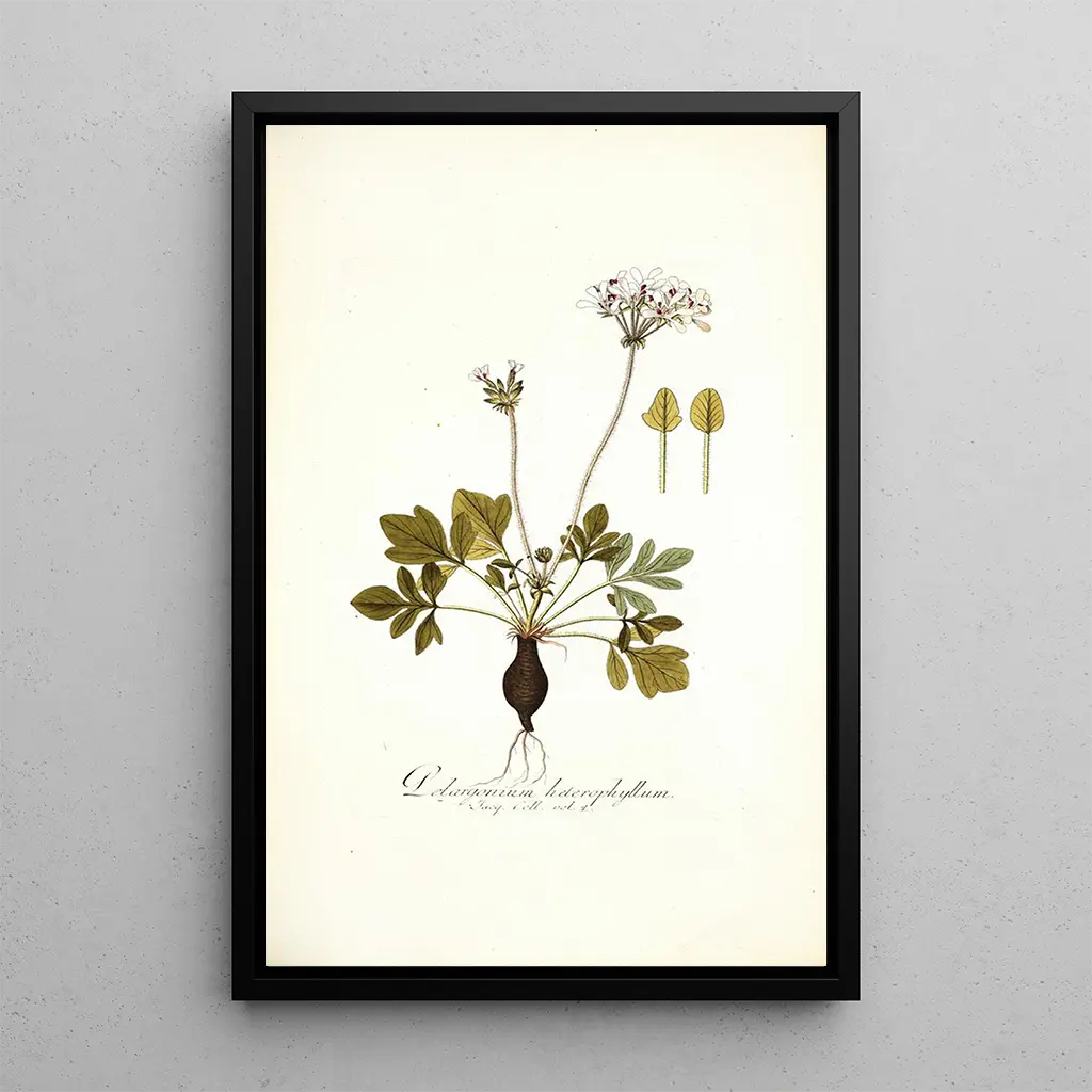 Kunsttrykket Pelargonium heterophyllum, udført af Nikolaus Joseph Freiherr von Jacquin, er en fejring af floraens rigdom. Dette værk, præget af finesse, viser blade med varierede former og livlige farver, der fanger øjet. Akvarelteknikken, anvendt med elegance, formidler gennemsigtigheden af blomsterbladene og teksturen af bladene, hvilket skaber en atmosfære, der er både levende og beroligende. Hvert detalje er omhyggeligt observeret, hvilket vidner om en passion for botanik og et ønske om at dele naturens skønhed.