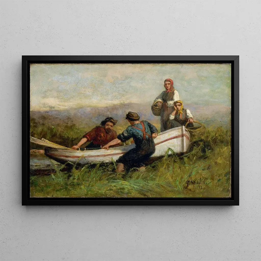 I dette kunsttryk af Personer nær en båd fanger Edward Mitchell Bannister essensen af en dag ved havet. De varme og jordnære farver flettes sammen med blå nuancer, hvilket fremkalder sollysets refleksion på vandet. Den dynamiske komposition, med livlige menneskefigurer, skaber en levende og engagerende atmosfære. De omhyggelige detaljer i sejlene og ansigterne tilføjer en følelsesmæssig dybde, der inviterer betragteren til at dykke ned i denne scene af fællesskab og maritimt arbejde. Bannister formår at formidle en fornemmelse af bevægelse, hvilket gør dette kunsttryk både realistisk og poetisk.