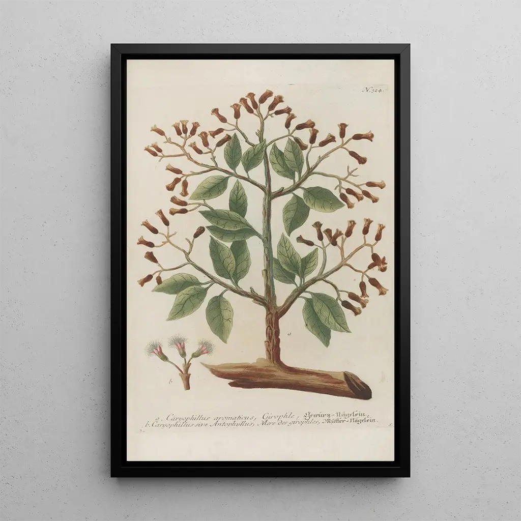 Kunsttrykket af Phytanthoza ikonografien Pl047 fordyber os i en rig og farverig botanisk verden. Dette værk, skabt af Johann Wilhelm Weinmann, skiller sig ud med sine omhyggelige detaljer og sine livlige farver, der fanger essensen af de afbildede planter. Nuancer af grøn, gul og rød flettes sammen for at give liv til en harmonisk komposition, hvor hvert element synes at fortælle en historie. Den anvendte graveringsteknik fremhæver de fine teksturer af blade og blomster, hvilket skaber en atmosfære, der både er beroligende og fascinerende, og som indbyder til flugt.