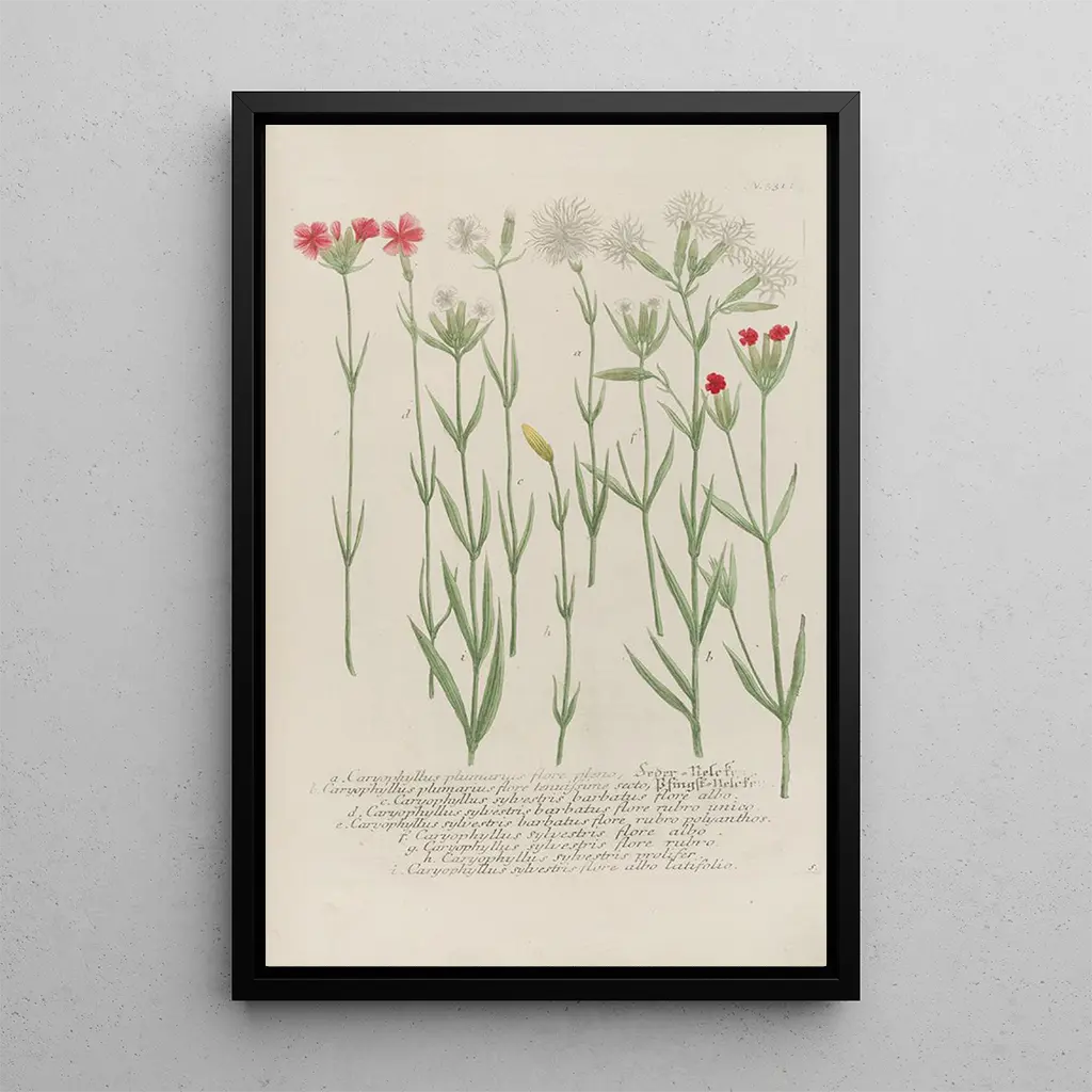 Kunsttrykket af Phytanthoza iconographia Pl054 tager os med på en rejse gennem en rig og farverig botanisk verden. Dette værk, skabt af Johann Wilhelm Weinmann, skiller sig ud med sin omhyggelige komposition og sine iøjnefaldende farver. Hvert detalje af planterne er omhyggeligt gengivet, hvilket skaber en atmosfære, der er både videnskabelig og poetisk. Nuancer af grøn, rosa og gul flettes harmonisk sammen, hvilket skaber en følelse af liv og bevægelse. Kunstneren formår at fange selve essensen af naturen og inviterer betragteren til en opmærksom refleksion over den vegetative skønhed.