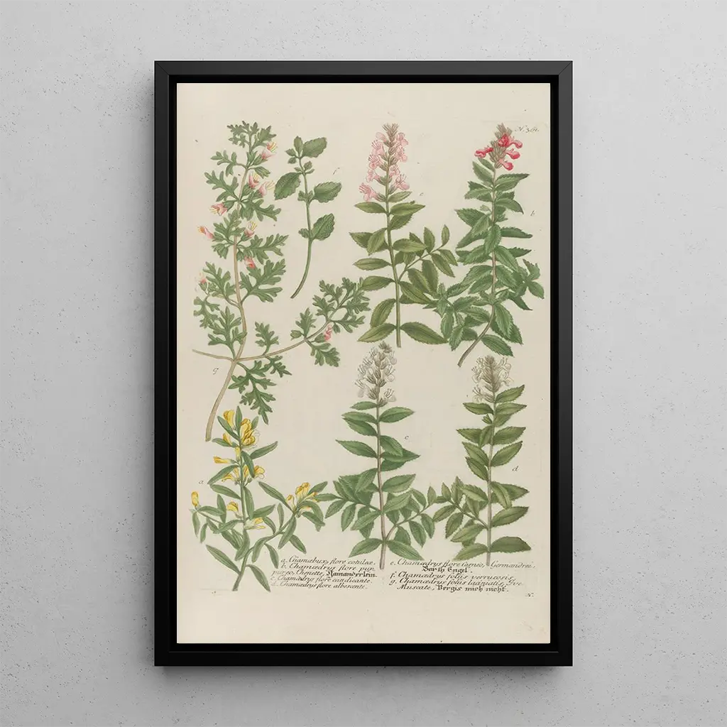 Kunsttrykket af Phytanthoza ikonografia Pl084 tilbyder en fascinerende dykning ned i den planteverden, der afslører en rig sammensætning med detaljer og farver. De levende nuancer af grøn, gul og rød væves sammen for at skabe en fængslende visuel harmoni. Den graveringsteknik, Johann Wilhelm Weinmann anvendte, fremhæver teksturen af bladene og blomstens delikatesse, hvilket inviterer betragteren til at udforske hvert element med opmærksomhed. Atmosfæren, der udspringer af dette værk, er både beroligende og stimulerende, som en gåtur i en frodig have, hvor hver plante fortæller en historie.