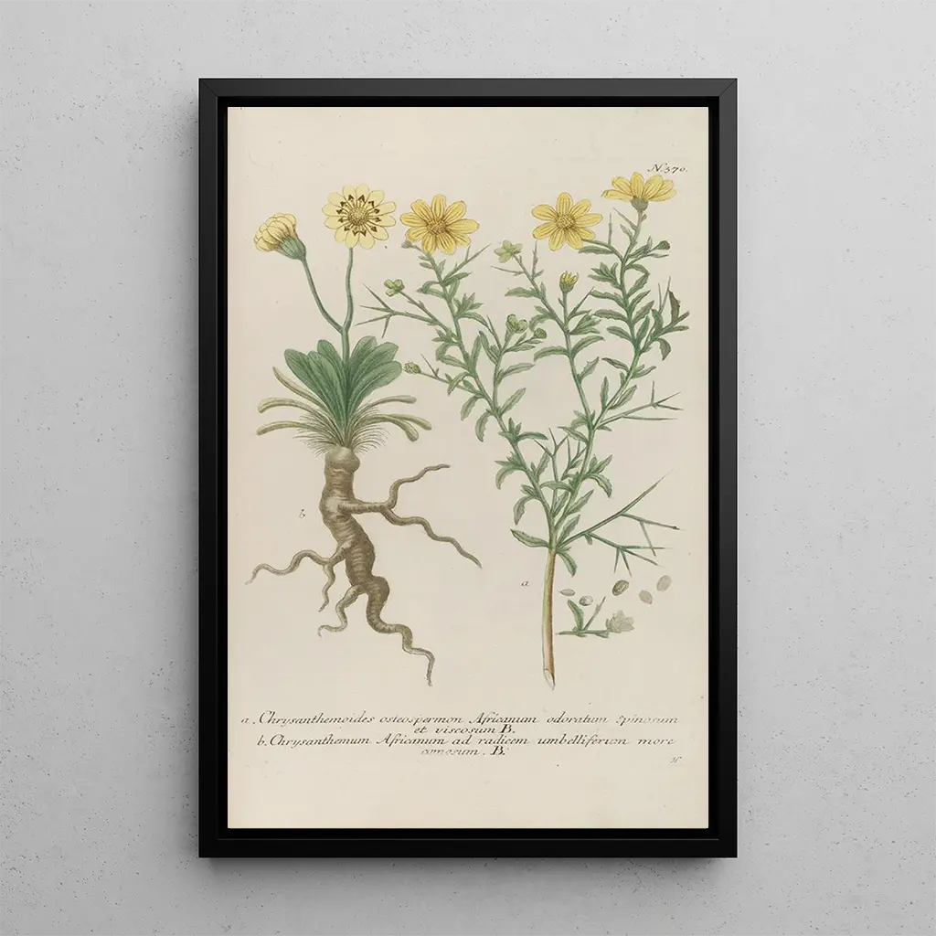 Kunsttrykket af Phytanthoza iconographia Pl093 er et fængslende værk, der fremhæver den rige eksotiske flora. Med sine livlige farver og varierede former synes hver plante at komme til live, hvilket inviterer seeren til at udforske en imaginær botanisk have. Nuancerne af blå, rosa og grøn flettes harmonisk sammen og skaber en atmosfære, der både er beroligende og stimulerende. Johann Wilhelm Weinmanns graveringsteknik gør det muligt at gengive hver detalje med slående præcision, hvilket giver en immersiv og berigende visuel oplevelse.