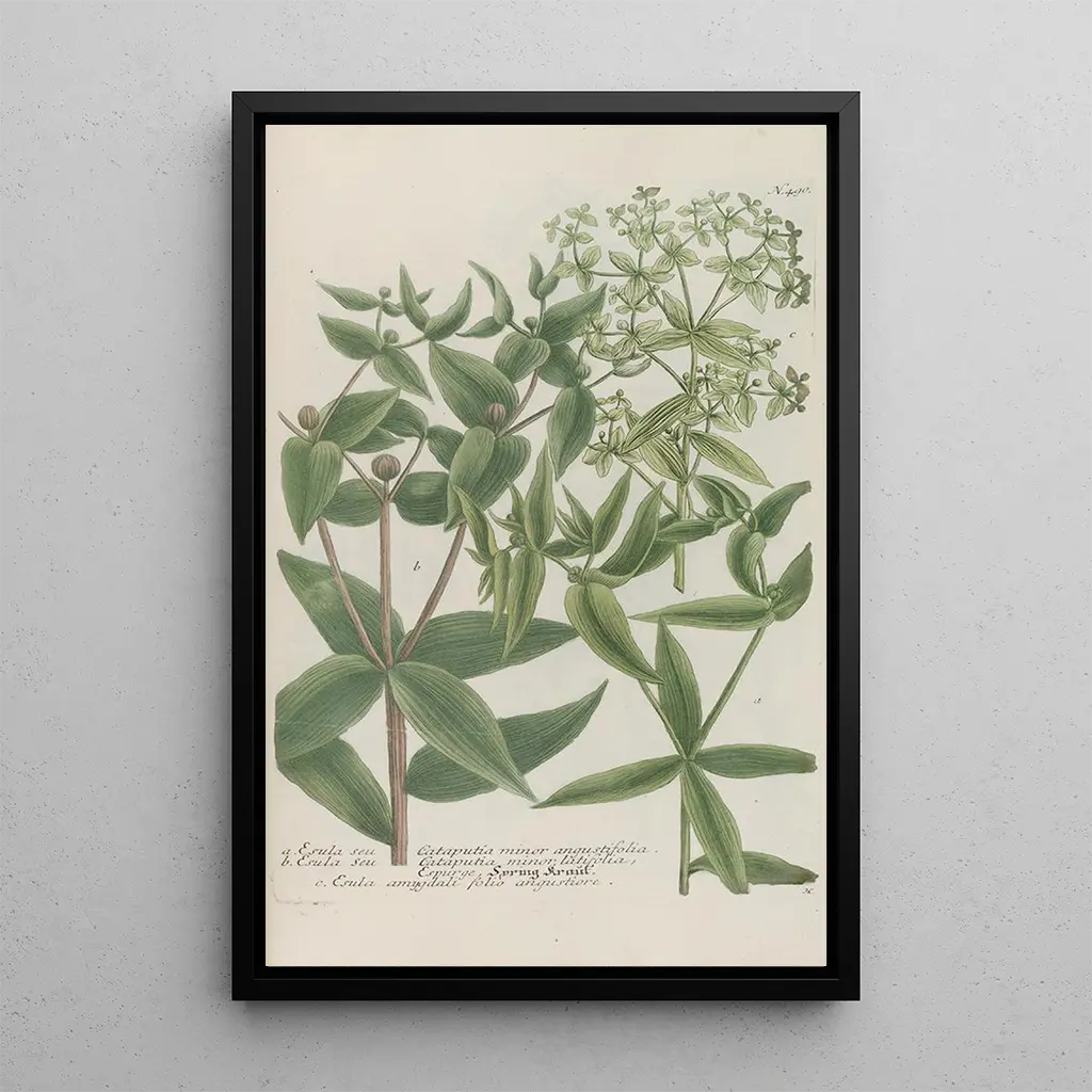 Kunsttrykket af Phytanthoza ikonografien Pl213 tager os med til en verden, hvor hver plante fejres med enestående omhu. De levende nuancer og de fine former af de illustrerede planter skaber en livlig og dynamisk atmosfære. Dette værk, gennem sin detaljerede tilgang, inviterer til en opmærksom betragning, der afslører floraens kompleksitet og skønhed. Johann Wilhelm Weinmanns graveringsteknik gør det muligt at fange selve essensen af planterne, hvilket gør dette billede til et ægte botanisk kunstværk, der vækker sanserne og stimulerer fantasien.