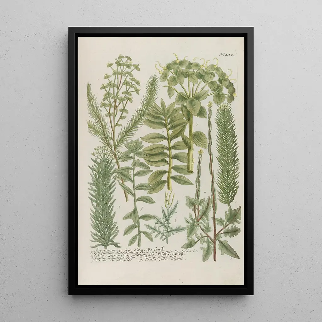 Den kunsttryk af Phytanthoza ikonografien Pl210 tager os med ind i en rig og farverig botanisk verden. Dette værk, skabt af Johann Wilhelm Weinmann, skiller sig ud med sine omhyggelige detaljer og sine livlige farver, der fanger essensen af de afbildede planter. Nuancer af grøn, gul og rød flettes harmonisk sammen og skaber en levende og dynamisk atmosfære. Den anvendte kobberstiksteknik fremhæver hver blad og hver blomst, hvilket giver en følelse af dybde og realisme. Dette lærred inviterer til forundring og til at betragte den naturlige skønhed.