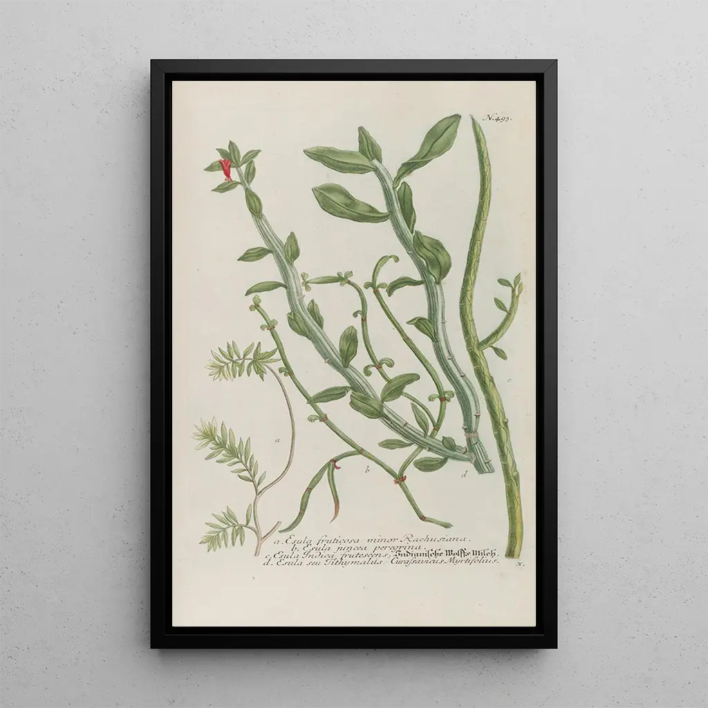 Kunsttrykket af Phytanthoza iconographia Pl216 tager os med på en rejse gennem en rig og farverig botanisk verden. Dette værk, udført med bemærkelsesværdig præcision, fremhæver en række eksotiske planter, hver med omhu og opmærksomhed på detaljer. De levende farver, fra skarpe grønne nuancer til dybe røde, skaber en livlig og dynamisk atmosfære. Den graveringsteknik, som kunstneren har anvendt, gør det muligt at fange teksturen og formen af planterne, hvilket inviterer betragteren til at udforske naturens skønhed gennem et kunstnerisk prisme.