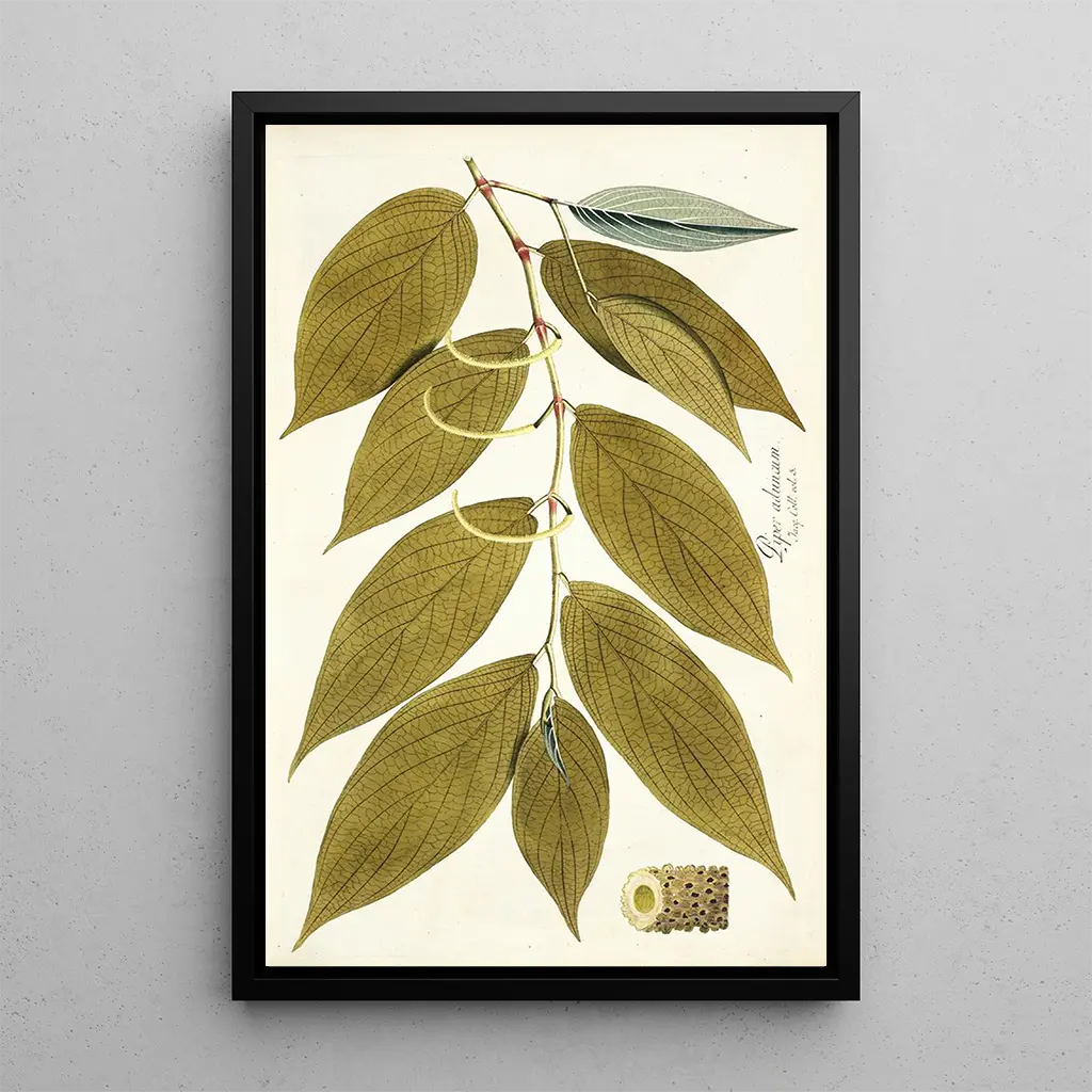Kunsttrykket af Piper aduncum er et ideelt dekorativt stykke til at tilføre et strejf af natur til dit hjem. Uanset om det er i stuen, på kontoret eller i soveværelset, fremkalder dette lærred en beroligende og inspirerende stemning. Dets trykkvalitet sikrer en trofast gengivelse af farver og detaljer i originalen, hvilket gør dette kunsttryk til et ægte æstetisk aktiv. Ved at vælge dette værk, vælger du en dekoration, der kombinerer elegance og kultur, samtidig med at den fejrer skønheden i den vegetale verden.