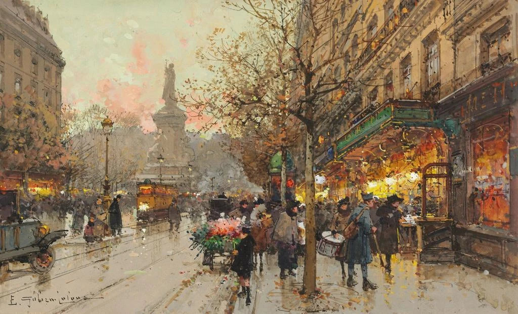 Eugène Galien-Laloue, aktiv i slutningen af det 19. og begyndelsen af det 20. århundrede, er kendt for sine skildringer af parisisk liv. Påvirket af impressionismen formår han at fange lys og bevægelse med stor finesse. Hans værker, ofte præget af nostalgi, vidner om en tid, hvor Paris var under stor forandring. Galien-Laloue formåede at indfange scener fra dagligdagen, hvilket gør hans malerier til værdifulde vidnesbyrd om den franske hovedstads historie. Hans unikke stil har sat sit præg på sin tid og fortsætter med at inspirere kunstelskere.