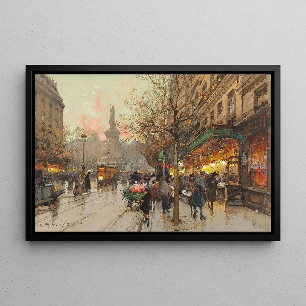 Den kunsttryk af Place de la République af Eugène Galien-Laloue fanger livets travlhed i et øjeblik i Paris i begyndelsen af det 20. århundrede. De varme og lyse farver fremkalder en glædelig atmosfære, hvor forbipasserende blander sig med skyggerne fra træerne. Kunstnerens teknik, der kombinerer akvarel og olie, giver en delikat tekstur til brostenene og bygningerne, mens de omhyggelige detaljer i personerne tilføjer en menneskelig dimension til denne byscene. Hvert penselstrøg synes at fortælle en historie og fordyber betragteren i livligheden af dette ikoniske sted.