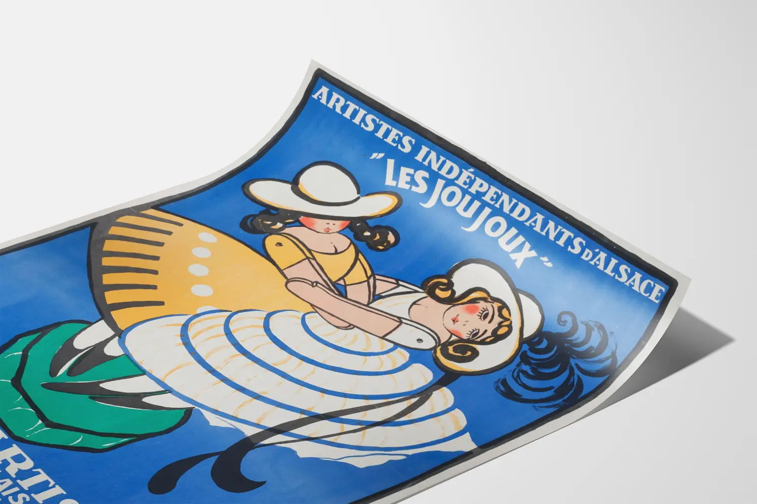Denne vintageplakat med titlen « Bal des Artistes Les Joujoux » skildrer en farverig og festlig scene, perfekt til en unik og autentisk vægdekoration. Den fremhæver to stiliserede dansere iført kjoler i livlige farver – den ene i gult og den anden i hvidt, begge med elegante hatte. Den intense blå baggrund skaber en iøjnefaldende kontrast til figurerne og tilføjer liv til hele kompositionen.