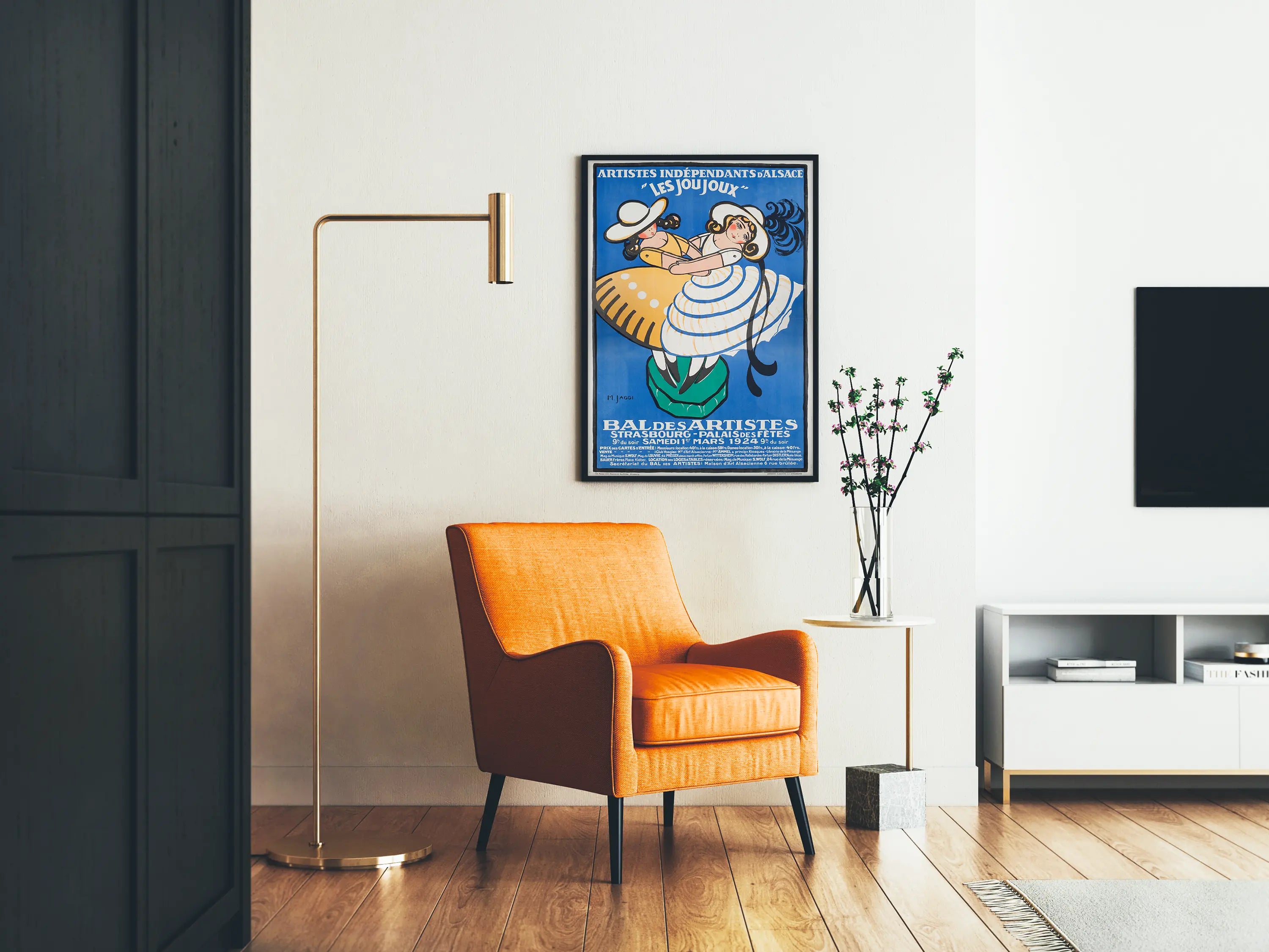Denne plakat, med sine klare farver og glade sammensætning, er ideel for alle, der ønsker at tilføje et kunstnerisk og retro præg til deres indretning. Placeret i en stue, spisestue eller kulturelt rum, bringer den en festlig og elegant atmosfære. De enkle, men udtryksfulde former, følger en grafisk stil, der minder om plakater fra 1920’erne – perfekt for entusiaster af vintage vægdekoration.