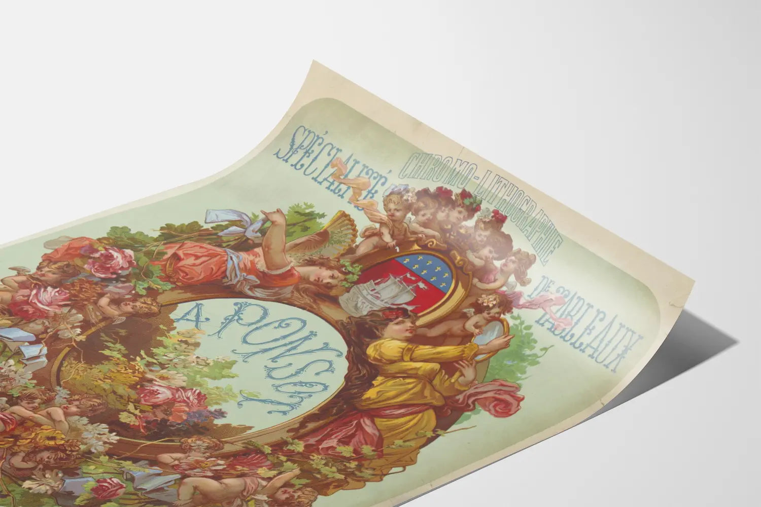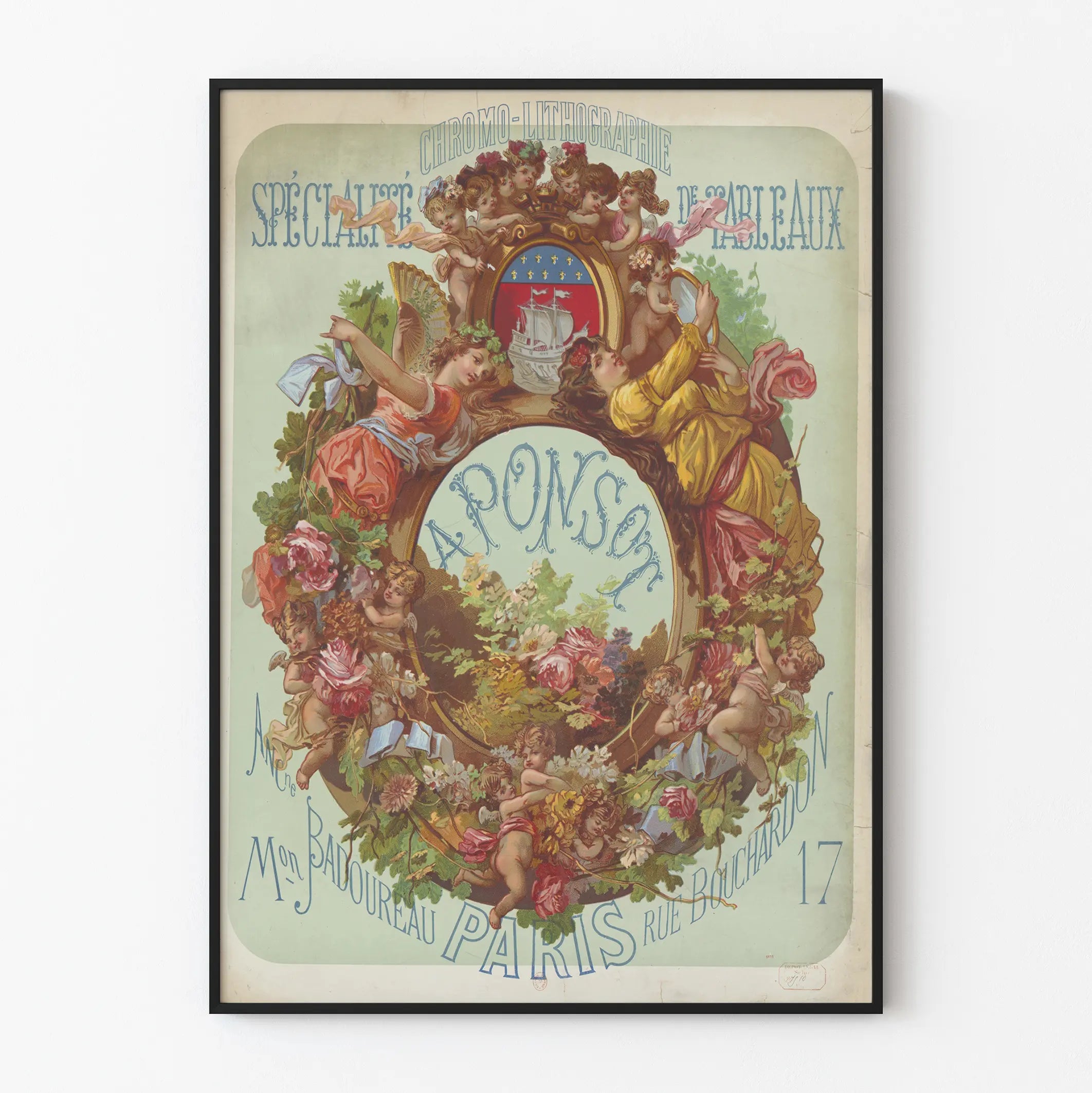 Denne vintage kromlitografiske plakat repræsenterer en kunstnerisk reklame for Ponsots specialitet med malerier, den gamle Badoureau-hus beliggende i Paris, Bouchardon-gade 17. Med en fin dekorationstil fra slutningen af 1800-tallet til begyndelsen af 1900-tallet er denne vægplakat forsynet med en oval ramme udsmykket med blomster, blade og mange små engle, der leger og omgiver midten med navnet "APONSON". Øverst er teksten "KROMLITOGRAFI" og "MALERISPECIALITET" skrevet med stilfulde bogstaver, karakteristisk for gamle plakater fra denne periode. En våbenskjold med et skib er placeret øverst på rammen, hvilket tilføjer et symbolsk præg til dette dekorative plakatsæt. De bløde pastelfarver kombineret med mere intense nuancer for figurerne og vegetation giver dette maleri en elegant og nostalgisk atmosfære. Dette vægdekoration er ideelt for entusiaster af retrokunst, gamle kromlitografier eller kunstneriske reklamer. Dets unikke stil og ornamentale udseende gør det til en raffineret og autentisk vægdekoration, der kan hænges i et klassisk eller eklektisk interiør. Denne gamle plakat tilføjer et strejf af visuel historie og traditionel grafisk kunst, der fremhæver en særlig kromlitografisk håndværk, der er karakteristisk for Paris.