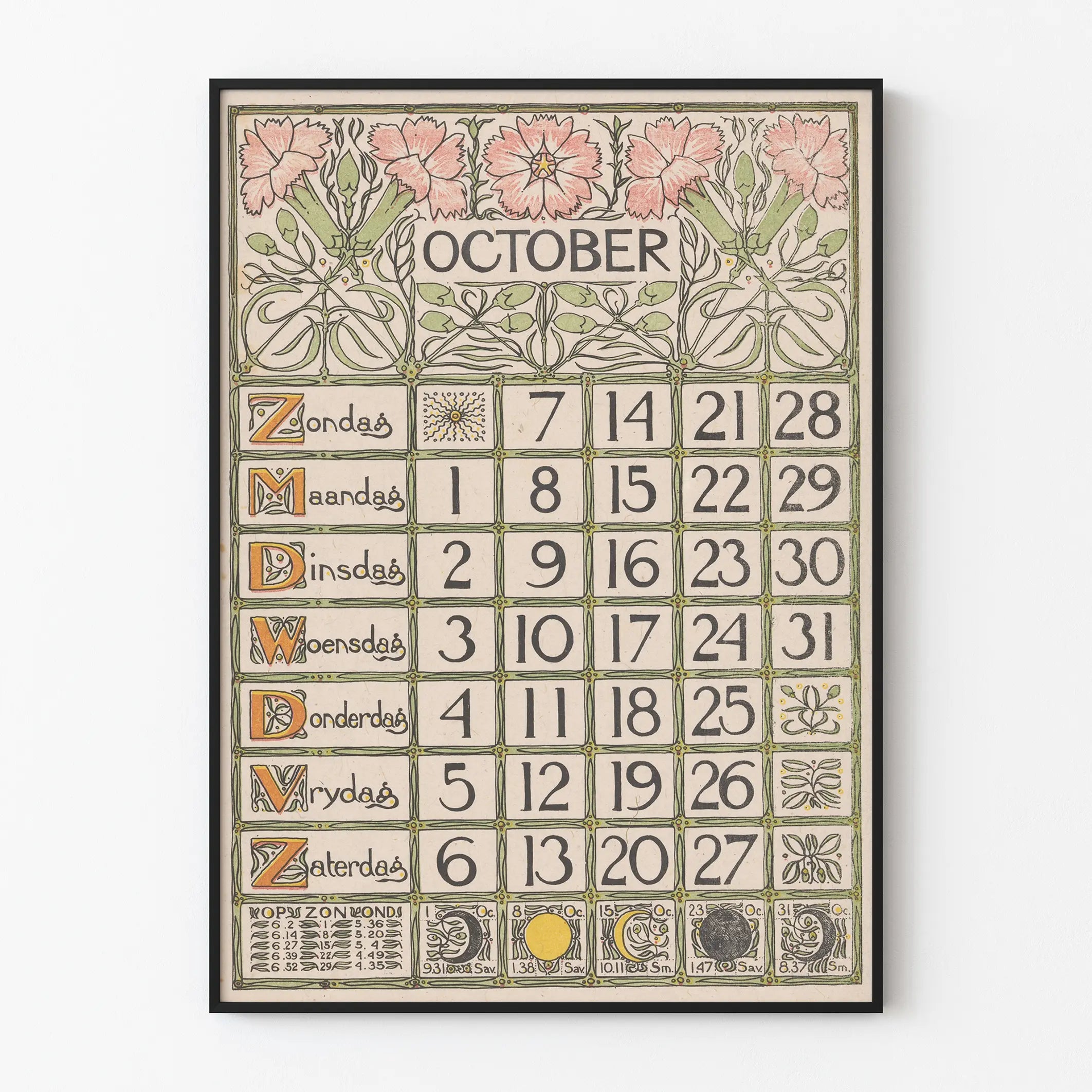 Denne oktober-kalenderplakat er udformet i en fin og raffineret art nouveau-stil. De blomsterdekorationer, der pryder toppen af plakaten, tilføjer et strejf af elegance og blidhed, med stiliserede blomster i rosa og grønne nuancer, der indrammer titlen "OKTOBER" skrevet med store bogstaver. Hver dag i måneden er arrangeret i et gitter på en lys baggrund, med felter afgrænset af fine linjer og små dekorative detaljer i grøn og guld. Ugedagernes forkortelser er skrevet på hollandsk i en ornamenteret kalligrafistil, understreget af omhyggeligt udformede versaler, hvilket fremhæver den gamle charme i dette vægkunstværk. Kompositionen inkluderer også symboler, der henviser til månefaserne nederst i gitteret, samt yderligere information i form af tal og stjernetegn, hvilket styrker både det praktiske og æstetiske aspekt af denne vægdekoration. Denne vintage-plakat repræsenterer perfekt den tiltrækning, der er forbundet med ældre genstande, hvor kalenderens funktion kombineres med dekorativ kunst – ideel til en retro-stemning eller til entusiaster af gammelt design. Som et ægte grafisk kunstværk kan denne kalenderplakat bruges som et dekorativt element i et hjem, der søger en elegant og historisk stil. Perfekt til vægdekoration i et kontor, bibliotek eller stue, imponerer denne oktober-kalender med sine omhyggelige detaljer, harmoniske pastelfarver og veludførte typografi. At vælge denne plakat betyder at berige sit opholdsrum med et grafisk stykke, der minder om den særlige æstetik i begyndelsen af det 20. århundrede, samtidig med at den bevarer det funktionelle præg, som dagligdags genstande fra fortiden har. Denne plakat er et ideelt valg til at give et væggen med karakter, samtidig med at den tilføjer et strejf af historie og visuel poesi.
