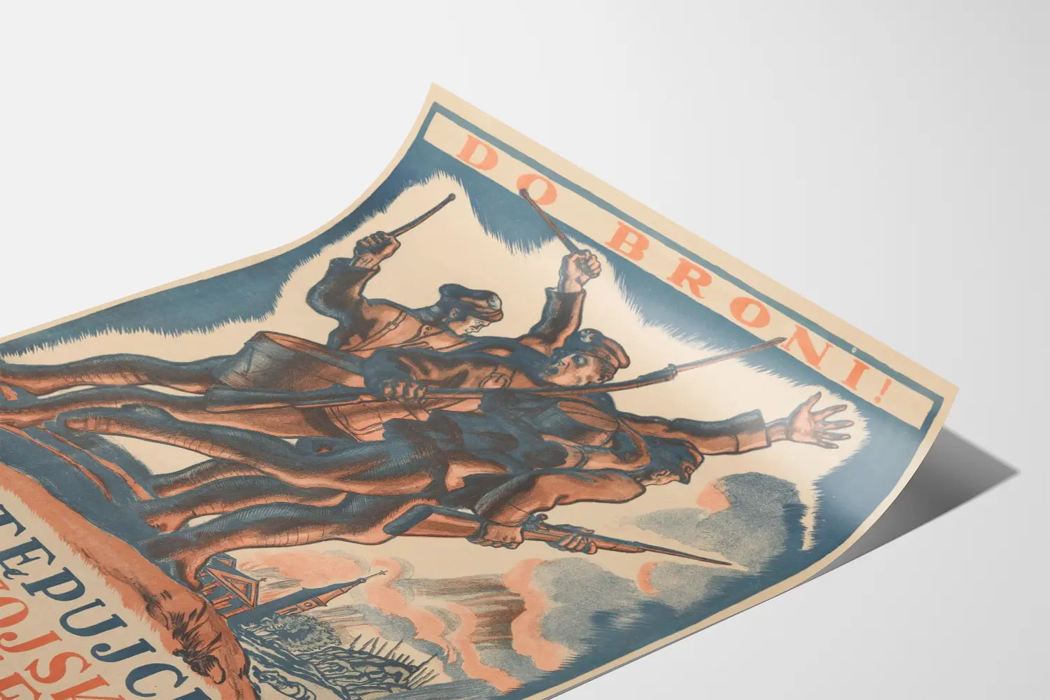Dette vintage vægkunstplakat illustrerer en livlig opfordring til at slutte sig til den polske hær med teksten på polsk « Do Broni! Wstępujcie do Wojska Polskiego! ». Den viser fire soldater i dynamisk bevægelse, bevæbnet med rifler med bajonetter, hvilket symboliserer militært engagement og mod. De primære farver, blå og rød på en beige baggrund, giver dette plakát et retro og historisk udseende, der styrker dets visuelle ægthed. I baggrunden ses et krigslandskab med brændende bygninger og en kirke, hvilket understreger hastværket i den nationale forsvarsopfordring. Dette dekorative billede er ideelt til en patriotisk og vintage stemning, og tilføjer en unik stil til dit hjem. Uanset om det er til stuen, kontoret eller et område dedikeret til historie, finder dette vægplakat sin plads i en indretning præget af modstandskraft og hyldest til militære værdier. Som et vægdekorationselement har dette vintage plakat et stærkt og udtryksfuldt design, perfekt for historieentusiaster eller dem, der elsker grafiske værker i retrostil. Det harmonerer smukt med en samling af plakater eller billeder med historisk tema. Det karakteristiske grafiske udtryk, med kraftige linjer og udtryksfulde gestus, fanger øjet og formidler en klar besked om engagement. Dette plakát er et dekorativt stykke, der symboliserer mobilisering og beslutsomhed, og vækker stolthed og arv gennem en velbevaret æstetik fra tiden. Ideelt til en original og meningsfuld vægdekoration.