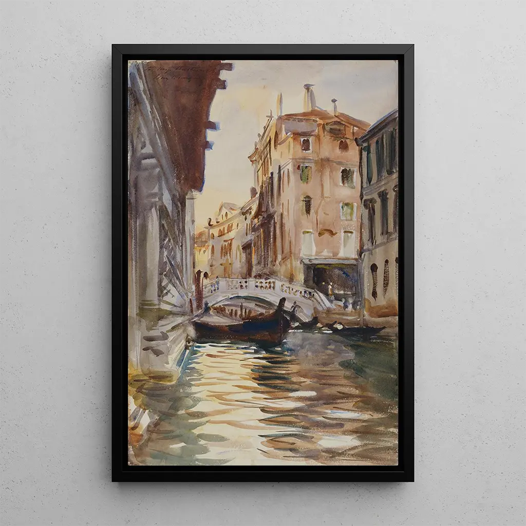 John Singer Sargent, født i 1856, er en af de mest anerkendte portrætmalere i sin tid, men han excellerer også i landskabsmaleri. Påvirket af impressionistisk bevægelse og europæiske mestre, har Sargent udviklet en unik stil, der kombinerer realisme og følsomhed. Hans værker, ofte præget af lys og farve, vidner om en tid, hvor kunsten frigjorde sig fra strenge konventioner. Ponte della Canonica, skabt i 1903, indgår i denne dynamik, og fanger ikke kun et sted, men også ånden af en vibrerende og levende Venedig.