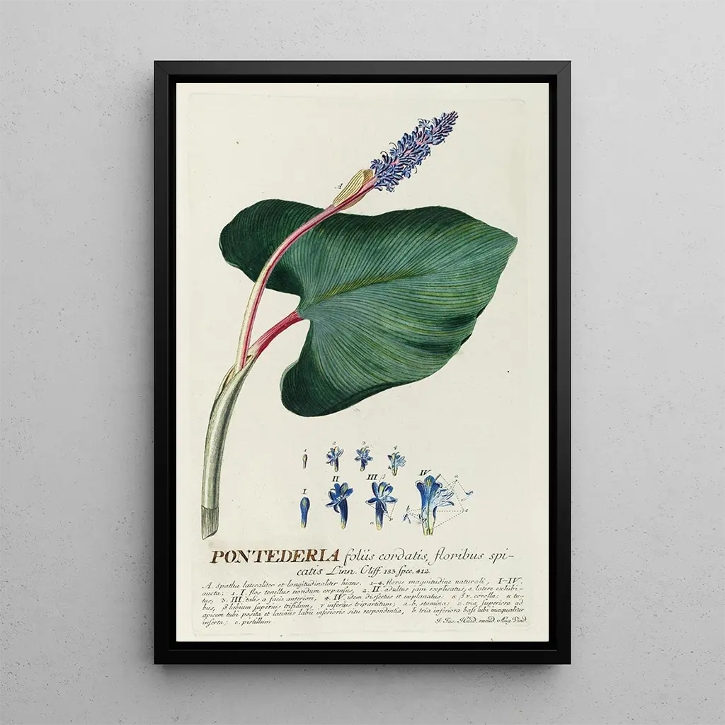 Kunsttrykket af Pontederia af Georg Dionysius Ehret er en fejring af det vandrige liv, hvor de livlige nuancer og flydende former mødes. Dette værk fremhæver skønheden i blomsterne på denne vandplante, med slående detaljer, der fanger lyset og vandet. De rige farver, fra lilla til grøn, skaber en dynamisk og levende atmosfære, der inviterer betragteren til at udforske mysterierne i vandøkosystemerne. Den graveringsteknik, Ehret bruger, gør det muligt at gengive hvert element med en præcision, der fremkalder naturens delikatesse.