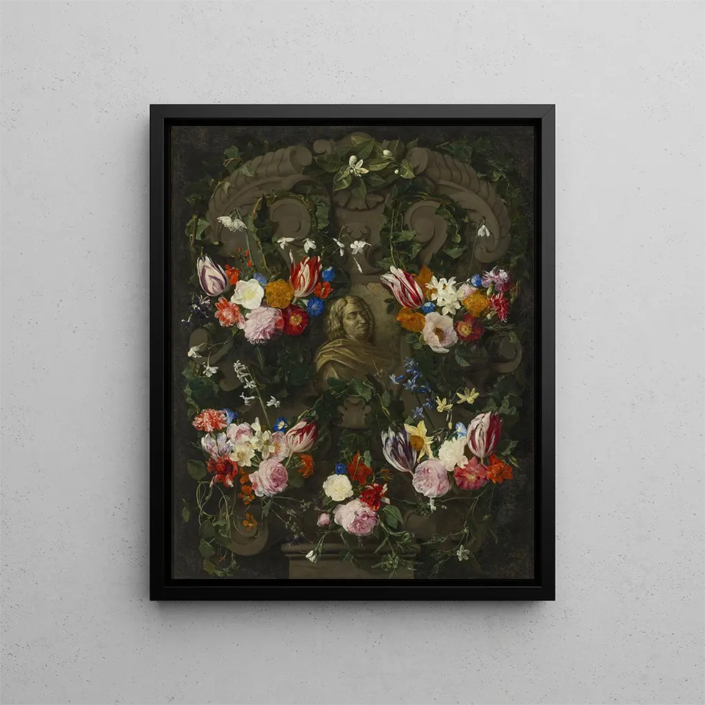 Daniel Seghers' stil, som kommer til udtryk i dette portræt, er kendetegnet ved en enestående beherskelse af lys og farve. Hvert penselstrøg synes at være en hyldest til skønheden, hvor detaljerne i folder og teksturer er gengivet med bemærkelsesværdig præcision. Kompositionen er omhyggeligt orkestreret, hvilket fremhæver Poussins ansigt, hvis eftertænksomme udtryk antyder en intellektuel dybde og en passion for kunst. Baggrunden, subtilt sløret, tillader blikket at fokusere på hovedmotivet, samtidig med at den tilføjer en dimension af mystik. Dette portræt nøjes ikke med at afbilde en mand; det indkapsler en æra, hvor kunst var både en refleksion af virkeligheden og et vindue til fantasien.