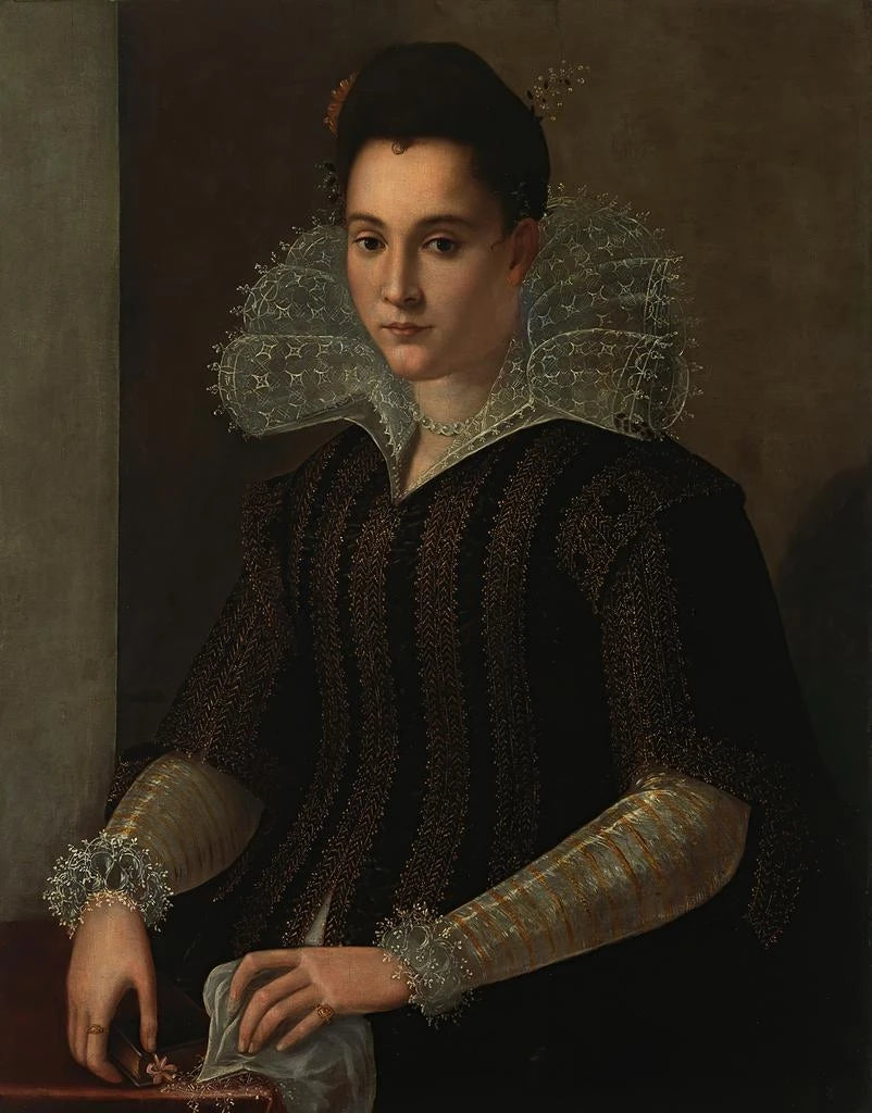 Værket skiller sig ud gennem sin mesterlige brug af farve og lys. Allori, en virtuos i chiaroscuro, skaber slående kontraster, der giver liv til den kvindelige figur. Paletten af delikate farver, der blander bløde toner med rige nuancer, tilføjer en næsten taktil dimension til lærredet. De minutøse detaljer i tøjet og tilbehøret vidner om en enestående håndværkskunst, mens den subtile udtryksfuldhed i damens ansigt afslører en introspektion, der inviterer til eftertanke. Denne evne til at fusionere teknik og følelser er det, der gør "Portræt af en dame" så fascinerende og tidløst, hvor hvert blik bliver en unik oplevelse.