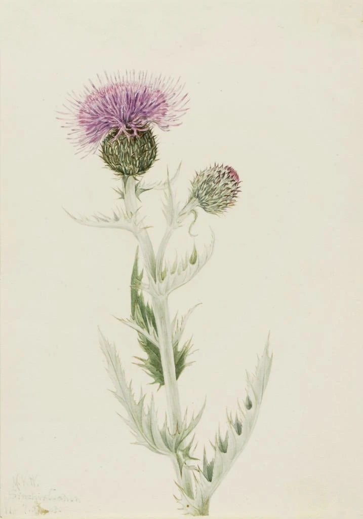 Mary Vaux Walcott : en pioner inden for botanisk kunst Mary Vaux Walcott, aktiv i begyndelsen af det 20. århundrede, er kendt for sin væsentlige rolle inden for botanisk kunst. Inspireret af tidens naturalistiske bevægelser, formåede hun at forene videnskab og æstetik i sine værker. Hendes passion for botanik førte hende til at udforske de amerikanske landskaber, hvor hun med præcision dokumenterede den lokale flora. Walcott var også en passioneret fortaler for naturbevarelse, hvilket gav hende en fremtrædende plads i kunstens historie. Hendes værker, herunder "Chardon des prairies", vidner om hendes engagement for den naturlige skønhed og beskyttelsen af arter.