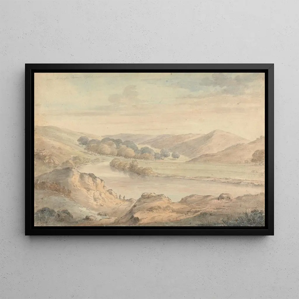 I denne kunsttryk af Près de Torrington, Devonshire, transporterer Kapitajn Francis Grose os til hjertet af et fredeligt engelsk landskab. De bløde nuancer af grønt og blåt blander sig harmonisk, hvilket skaber en atmosfære af ro. Teknikken med oliemaling gør det muligt at fange de fine nuancer af lyset, der reflekteres på vandet og lyser op i bladene. Kompositionen, med sine flydende linjer og organiske former, inviterer til eftertanke og fremkalder en fredelig gåtur gennem det engelske landskab.
