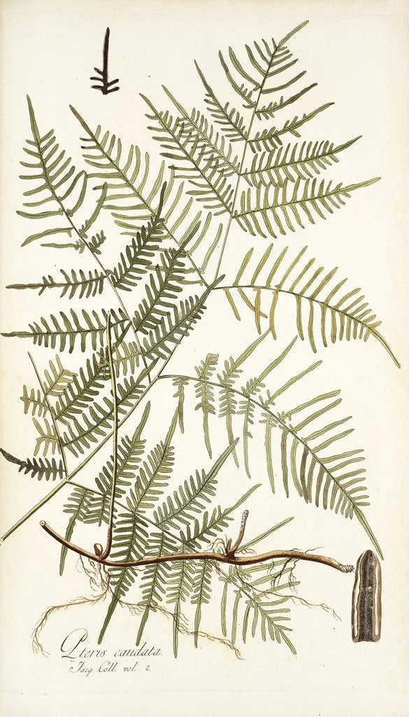 Kunsttrykket Pteris caudata, udført af Nikolaus Joseph Freiherr von Jacquin, fremkalder en frodig natur, hvor delikatesse af bregnebladene smelter sammen med det omgivende lys. Nuancerne af grønt, fra det blideste til det dybeste, skaber en visuel harmoni, der transporterer betragteren til en verden af ro. Akvarelteknikken, anvendt med dygtighed, fanger gennemsigtigheden og letheden af bladene, samtidig med at den afslører subtiliteter i skygger og reflekser. Atmosfæren, der udspringer af dette værk, er både beroligende og opkvikkende, og inviterer til en omhyggelig betragning af den naturlige skønhed.