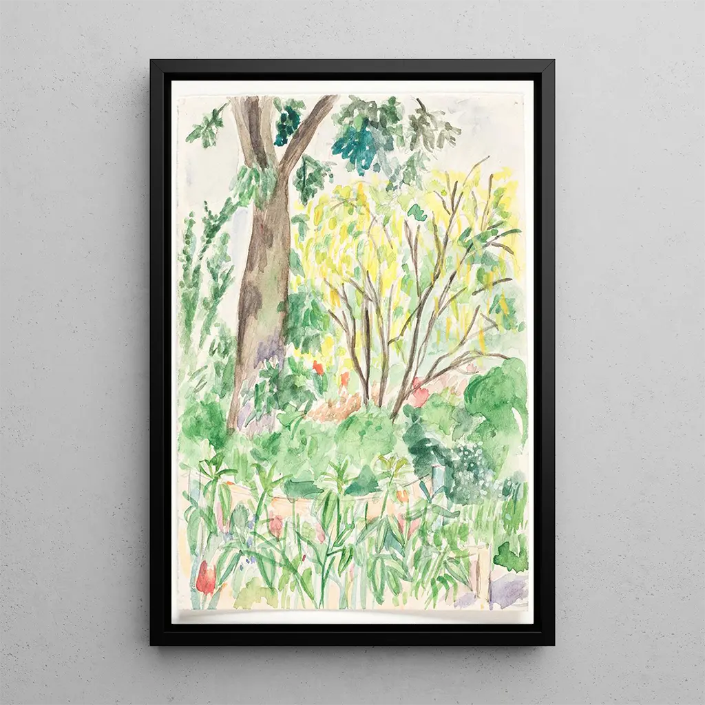 I "Pludselig regn af guld i en have" tager John Christensen os med til en verden, hvor lyset danser på blade og blomster. Kompositionen, rig på detaljer, fremkalder en scene af en frodig have, badet i gyldent lys. De livlige farver, fra dybe grønne til strålende gule, skaber en atmosfære af ro og magi. Christensens teknik, der blander impressionisme og realisme, giver næsten fornemmelsen af luftens blidhed og blomsterduften. Hvert penselstrøg synes at fange et flygtigt øjeblik, en invitation til at forundres over naturens skønhed.