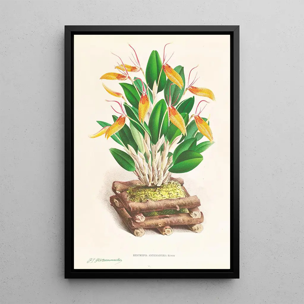 Kunsttrykket af Restrepia antennifera tager os med ind i en verden, hvor naturen udtrykker sig med glans. De livlige nuancer og de unikke former i denne orkidé er kyndigt fanget af kunstneren, hvilket afslører biodiversitetens rigdom. Lærredet udstråler en levende og dynamisk atmosfære, der inviterer til forundring. Hvert eneste detalje, fra de delikate kronblade til de vibrerende nuancer, vidner om kunstnerens passion for botanik. Dette maleri er meget mere end blot en gengivelse; det er en fejring af den naturlige skønhed, der omgiver os.