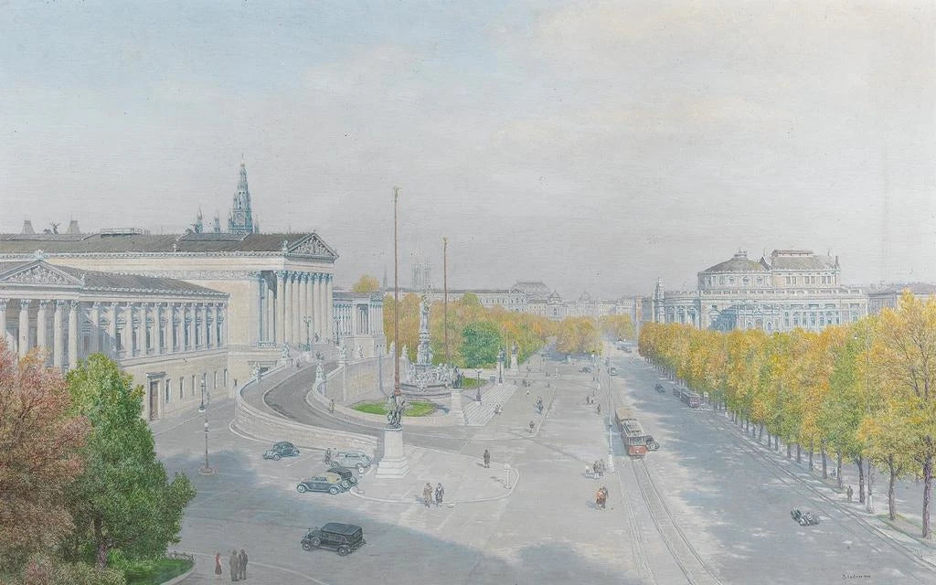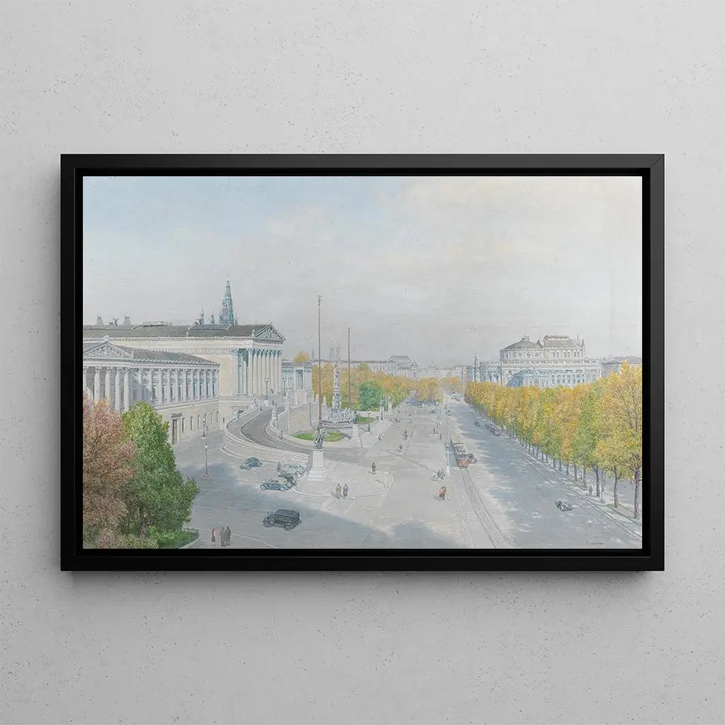 "Ringstraße med Parlament og Burgtheater" er et værk, der indfanger essensen af den wiener arkitektur. Lærredet skildrer majestæten af de ikoniske bygninger, der omgiver denne berømte boulevard, med særlig opmærksomhed på de arkitektoniske detaljer. De levende farver og lyslege skaber en livlig, næsten håndgribelig atmosfære, hvor man næsten kan høre byens hvisken. Den anvendte malerteknik, sandsynligvis olie, gør det muligt at gengive teksturernes rigdom og skyggerne, hvilket giver en dynamisk vision af denne ikoniske vej.