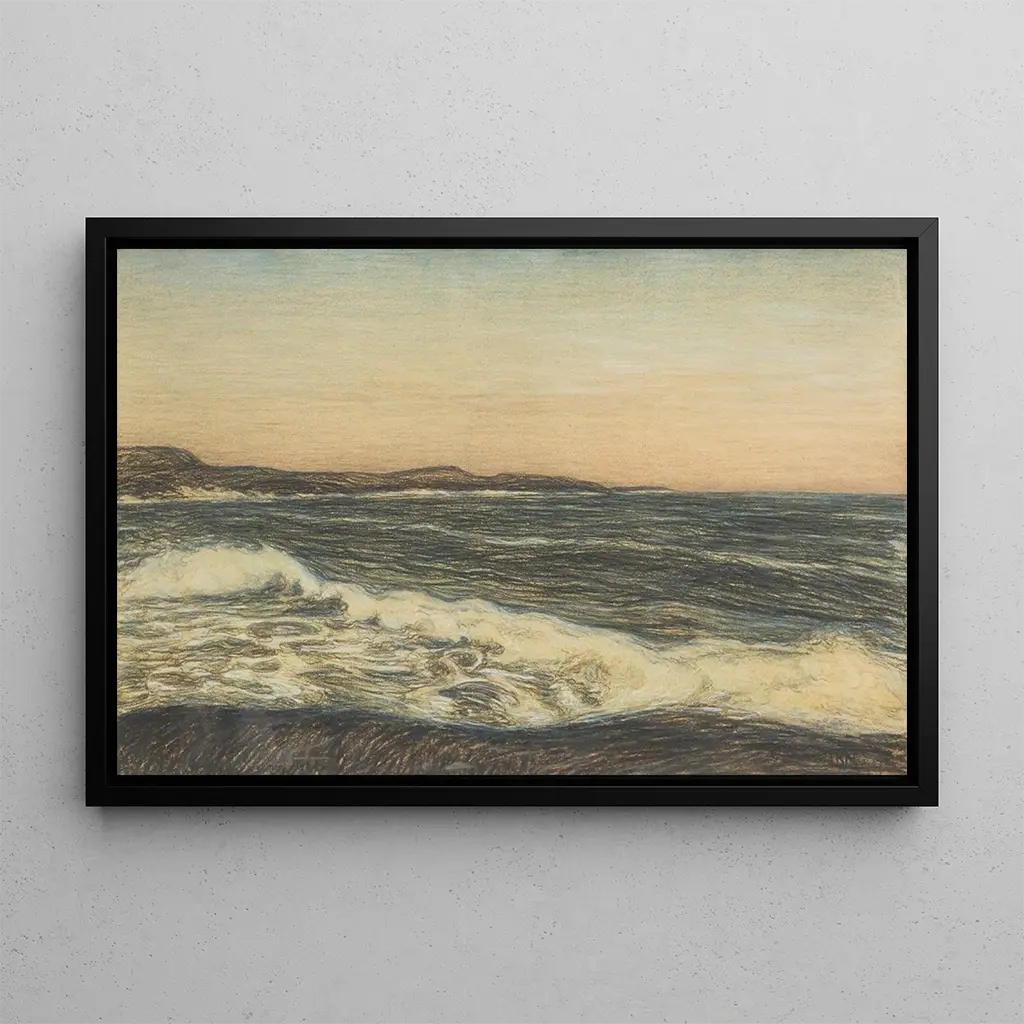 I dette fængslende kunsttryk tager Karl Nordström os med til kysten af et maritimt landskab, hvor havet og himlen synes at smelte sammen i en perfekt harmoni. Nuancer af blå og grøn blandes med strejf af hvid, hvilket fremkalder den friske luft fra havet og bølgernes bevægelse. Nordströms impressionistiske teknik kommer til udtryk gennem dynamiske penselstrøg, der skaber en levende og immersiv atmosfære. Hvert element i kompositionen, fra skyer til reflekser på vandet, inviterer til en rolig eftertanke, som om man kan mærke vindens pust og saltets duft.