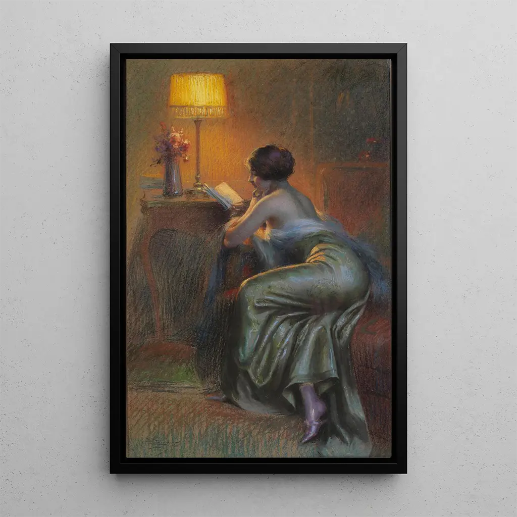 Maleriet Le Roman af Delphin Enjolras tager os med ind i en verden præget af finesse og poesi. Pastelfarverne, subtilt nuancerede, fremkalder en blid og drømmende atmosfære. Kompositionen, centreret omkring en elegant kvindefigur, fanger blikket og inviterer til eftertanke. De omhyggelige detaljer, fra folder til udtryk, vidner om en enestående håndværkskunst. Enjolras formår at fange øjeblikkets essens, hvilket gør dette kunsttryk både tidløst og levende, som om scenen kan blive levende når som helst.