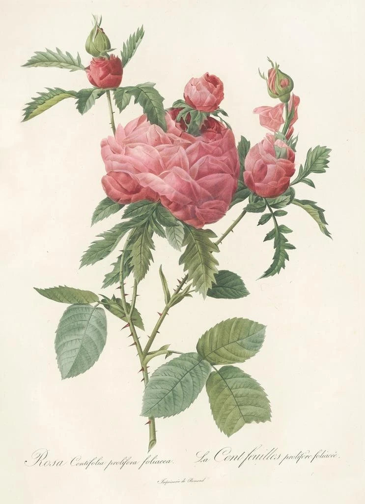 Pierre Joseph Redouté, kaldet "Blomsterens Raphael", var en belgisk kunstner og illustrator fra det XVIII. århundrede, kendt for sine botaniske kunstværker med enestående præcision. Påvirket af de kongelige haver i Frankrig, formåede han at fange skønheden i planterne med en sådan finesse, at han blev den officielle kunstner for Marie-Antoinette. Redouté spillede en central rolle i botanisk illustration, hvor kunst og videnskab forenede sig. Hans værker, herunder Rosa Centifolia Prolifera Foliacea, vidner om en tid, hvor botanikken var i krydsfeltet mellem æstetik og videnskabelig undersøgelse, hvilket markerede et vendepunkt i blomsterkunsten.