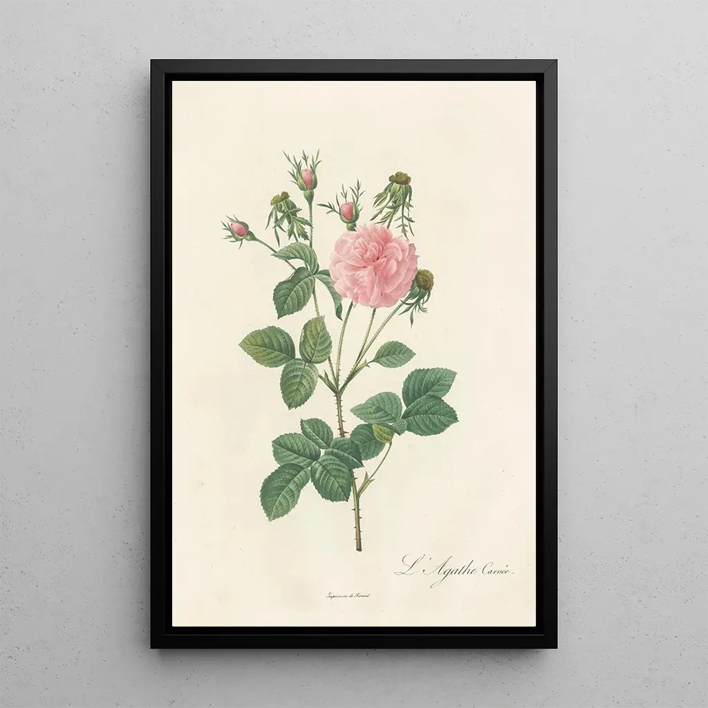 Kunsttrykket af Rosa Gallica Agatha Incarnata tager os med ind i en verden af blidhed og naturlig skønhed. Dette værk af Pierre Joseph Redouté, berømt for sine botaniske illustrationer, skiller sig ud med sine sarte pastelfarver og omhyggeligt detaljerede elementer. Rosen, med sine bløde lyserøde nuancer, virker næsten håndgribelig, mens de grønne nuancer i bladene skaber en beroligende harmoni. Aquarellteknikken, mestret af Redouté, giver dette lærred en let og luftigt atmosfære, der inviterer betragteren til at forundres over naturens pragt.