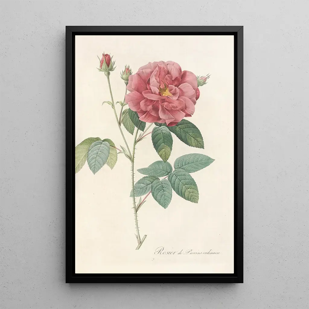 Kunsttrykket af Rosa Gallica Officinalis tager os med ind i en blomstrende verden fyldt med blidhed og finesse. Kronbladene, i en sart rosa nuance, blomstrer yndefuldt, mens de grønne nuancer i bladene skaber en harmonisk kontrast. Akvarelteknikken, mestret af Pierre Joseph Redouté, giver dette værk en lethed og gennemsigtighed, der fremkalder den flygtige skønhed af roser. Atmosfæren, der udspringer af dette lærred, inviterer til eftertanke, som om hvert detalje var en ode til naturen.